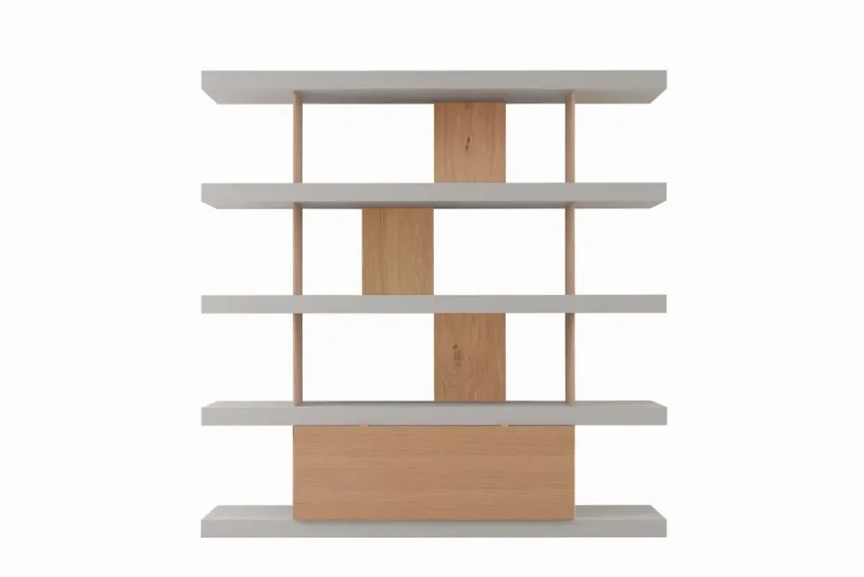 Libreria a pavimento autoportante bifacciale con piani orizzontali in tamburato di spessore mm 80, laccati opaco goffrato, colore Grigio Forme’s. Le linee verticali sono impiallacciate in Rovere Naturale. Completa il sistema un contenitori a ribalta, in Rovere Naturale. Dimensioni prodotto: L 200 × H 200.8 × P 42 cm