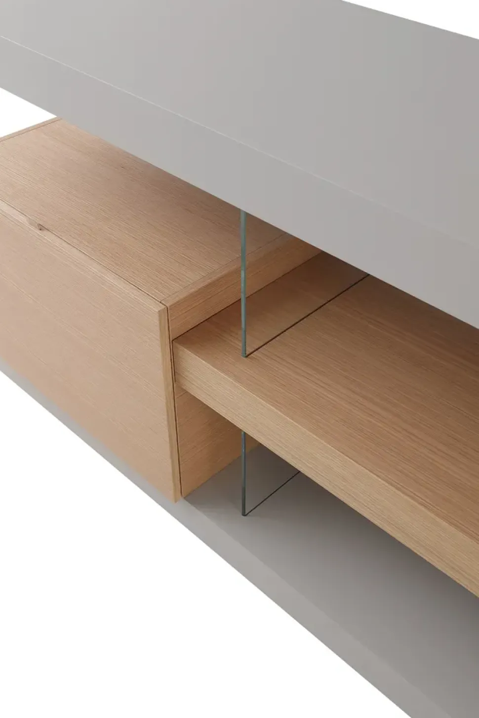 Complemento a pavimento bifacciale con piani orizzontali in tamburato di spessore mm 80, impiallacciati in Rovere Naturale, finitura opaca e laccati opaco goffrato color Grigio Forme’s. Le linee verticali di spessore 8 mm, sono composte da cristalli extra chiari temperati e da pannelli di particelle di legno laccato opaco goffrato color Beige e Grigio Forme’s. Completa il sistema un contenitore a ribalta da cm. 60, in Rovere Naturale, finitura opaca. Tre contenitori pensili a muro, laccati opaco goffrato color Grigio Forme’s, con interno un ripiano di mezza profondità. Dimensioni Prodotto base: L 300 x H 76,4 X P 42 cm. Dimensioni Pensili a muro: L 300 x H 40 x P 39,8 cm.