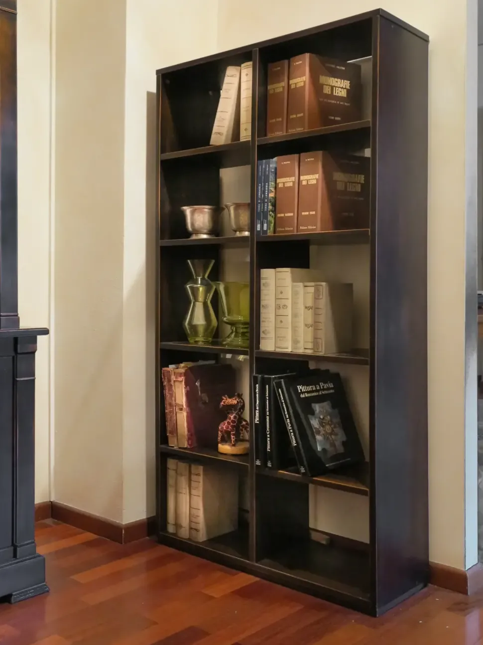 Dotata di 10 vani con ripiani fissi, presenta una finitura con base tinta ciliegio e dettagli nero ombreggiato. Ideale per arredare uno studio o un soggiorno.