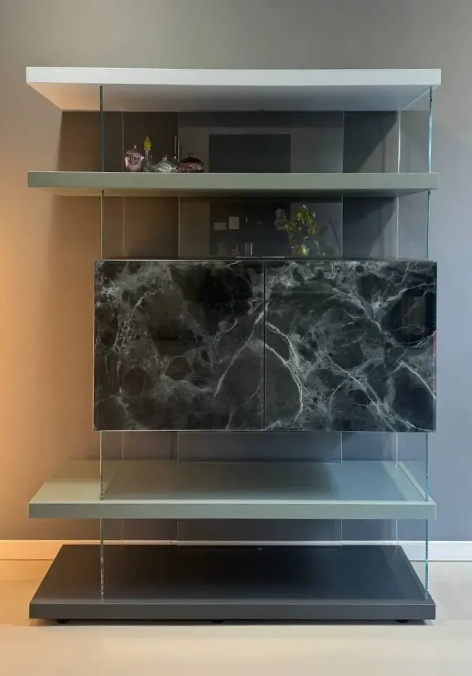 Leggera ma dal forte impatto visivo, colpisce per la raffinatezza delle sue finiture. Proposta con le mensole laccate grafite, argilla, artico e contenitore laccato grafite con frontale e schienale XGLASS lucido verde alpi.