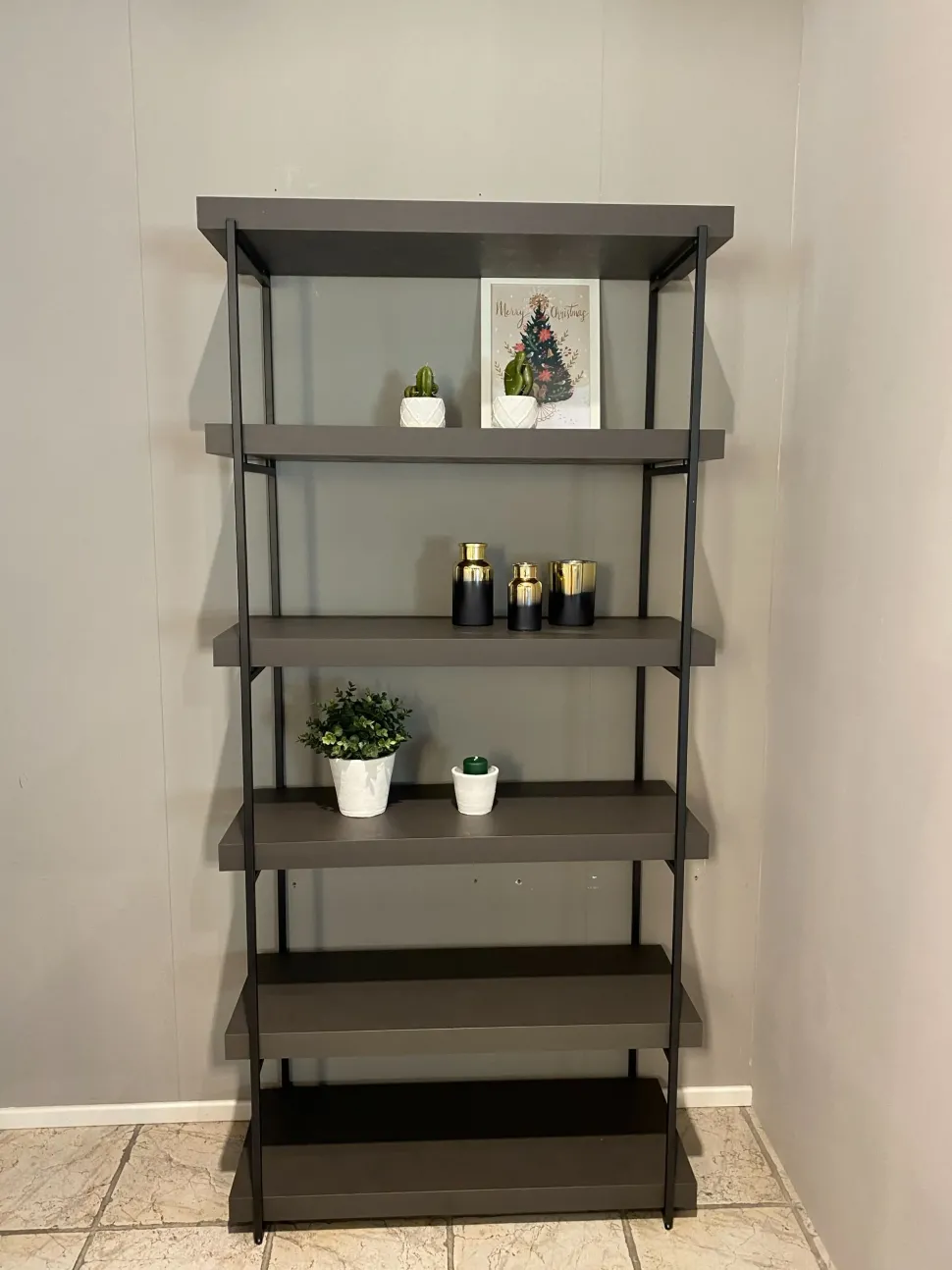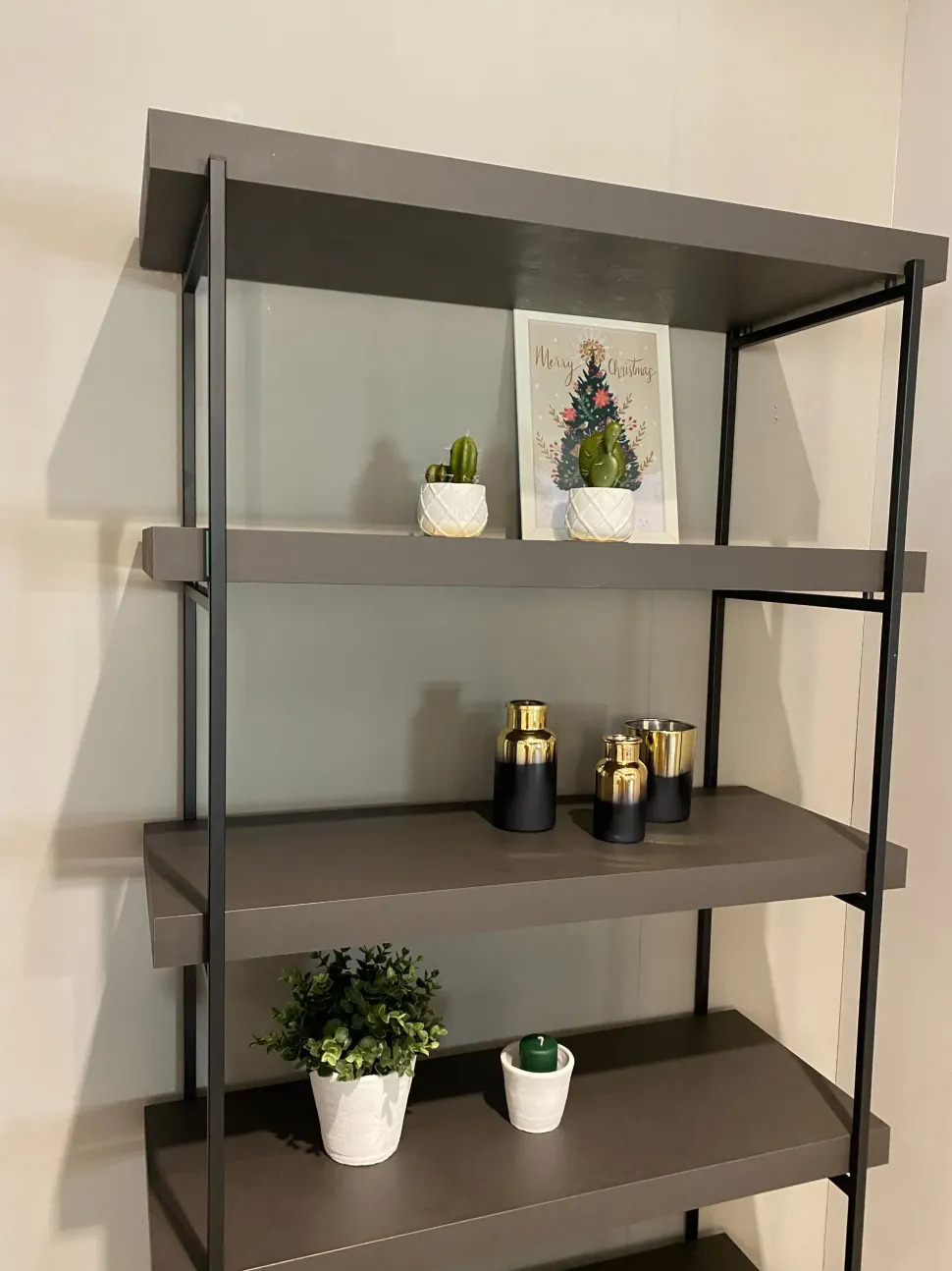 Libreria modello LIBRA di Connubia. Struttura finitura nero opaco con ripiani in finitura nobilitato cemento scuro. Le dimensioni l 90 p 38,5 h 184,5 cm. I ripiani hanno spessore 3 cm. E’ consigliato il fissaggio a parete. I piedi ni sono regolabili.