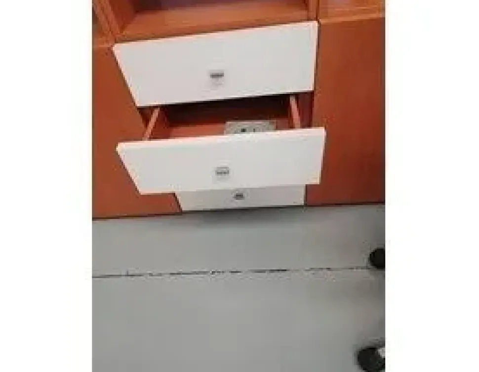 Libreria moderna componibile vero legno ” di LINEA IN ARREDAMENTI a 4 ante + cassettiera esterna con 4 cassetti e vani a giorno, scrivania sagomata da appoggio e sedia con ruote. La libreria come si può vedere dalle foto è possibile inserirla in una cameretta con la scrivania sempre utile, tolta la scrivania la libreria arreda anche un soggiorno o un ingresso. Scheda informativa del prodotto di Qualita` MADE IN ITALY e caratteristiche principali Libreria – struttura libreria in legno impiallacciato faggio – pannellatura retro in legno laccato goffrato antigraffio, finitura bianco – cassettiera con 4 cassetti in legno laccato goffrato antigraffio, finitura bianco – apertura ante/cassetti con maniglia alluminio satinato – cassetti con guide metalliche – ripiani a giorno sp. cm 2,5 – 3 ripiani interni spostabili – misure: L. cm 240 x P. 47 x H. 226 Scrivania – struttura sagomata sp. cm 3 con angolo stondato, in legno laccato goffrato antigraffio – finitura bianco con gamba di appoggio in metallo – misure L. cm 180 x P. 44/70 Sedia con ruote in legno laccato goffrato antigraffio, finitura azzurro