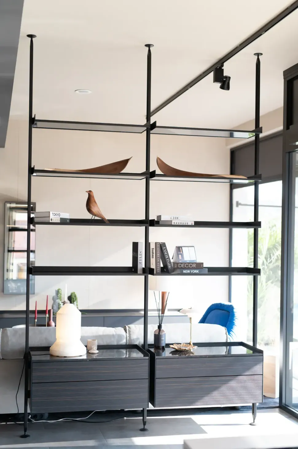 Forme decise e materiali di qualità caratterizzano tutte le librerie Rimadesio: scopri il modello in metallo qui disponibile e completa il soggiorno.