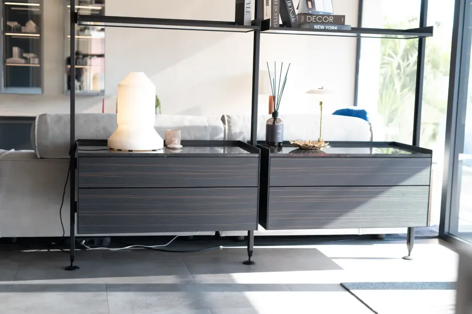 Libreria Zenit con montanti fin.nero 13 e contenitori fin.700 Ebano Taiga, ripiani telaio fin.Nero e vetro Grigio 63, con top fin.Marmo Marquina 181