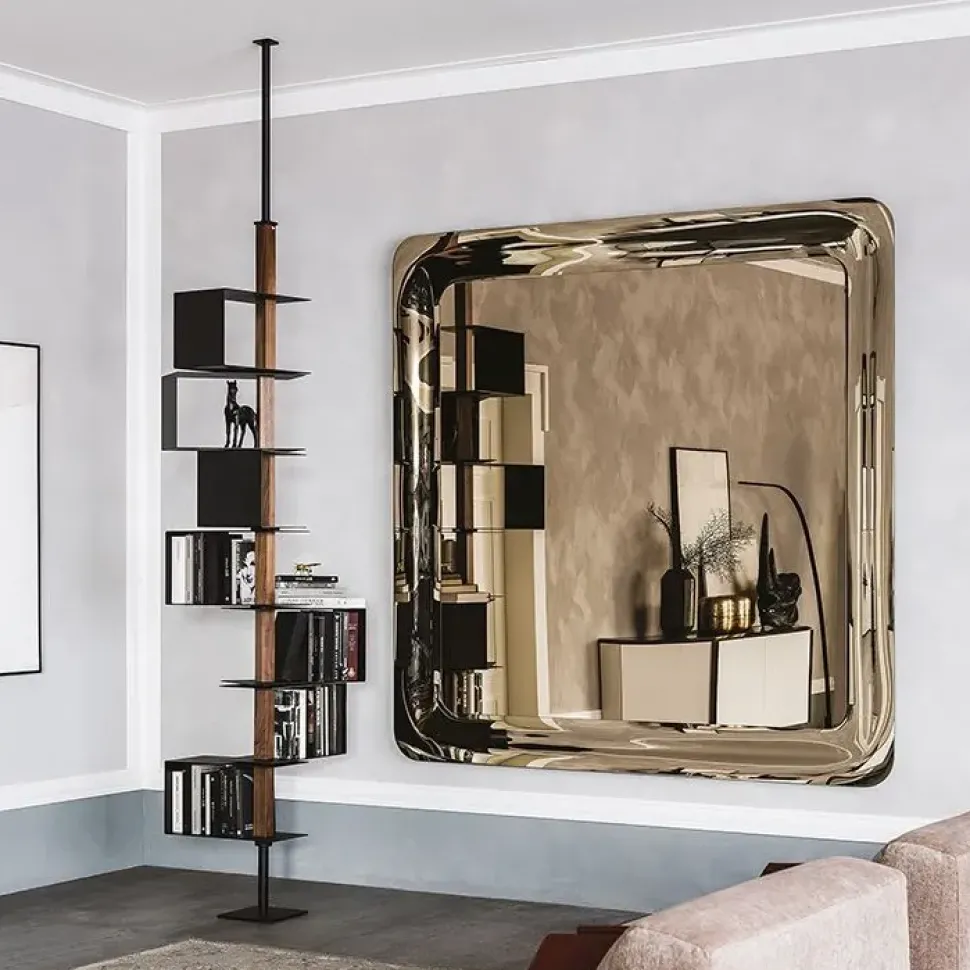 Libreria a soffitto con struttura e ripiani in acciaio verniciato goffrato titanio, graphite, bianco o nero e inserti in noce Canaletto o rovere bruciato. Dimensioni 68x68x300h