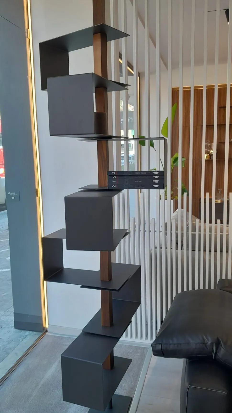 Libreria a soffitto con struttura e ripiani in acciaio graphite e inserti in noce canaletto. Minimo 240 massimo 300