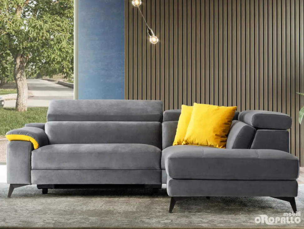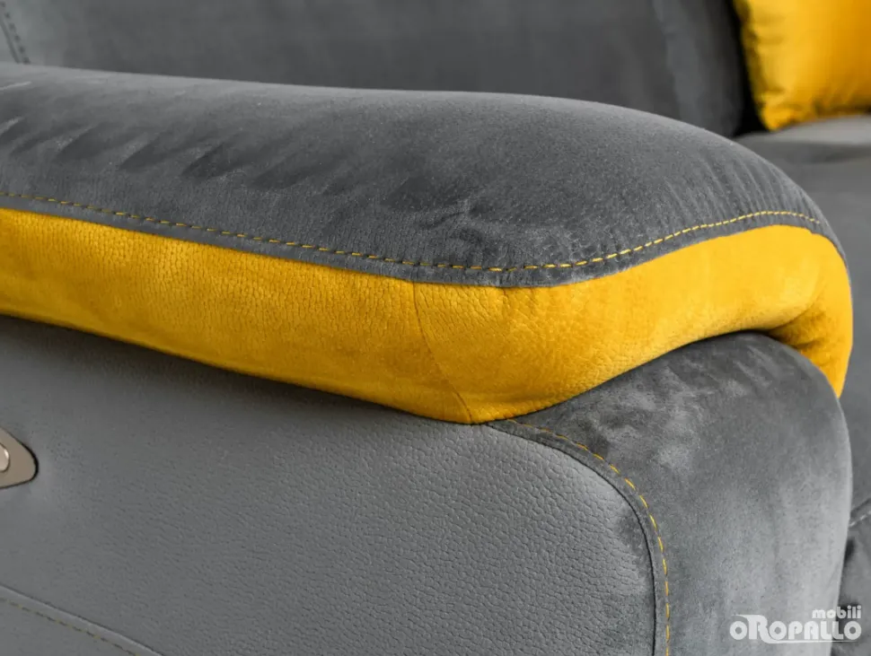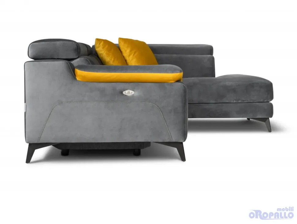 Divano ad angolo in tessuto Cat. C Carabù 77 – inserto Carabù 131. Dotato di poltrona XL con recliner elettrico.