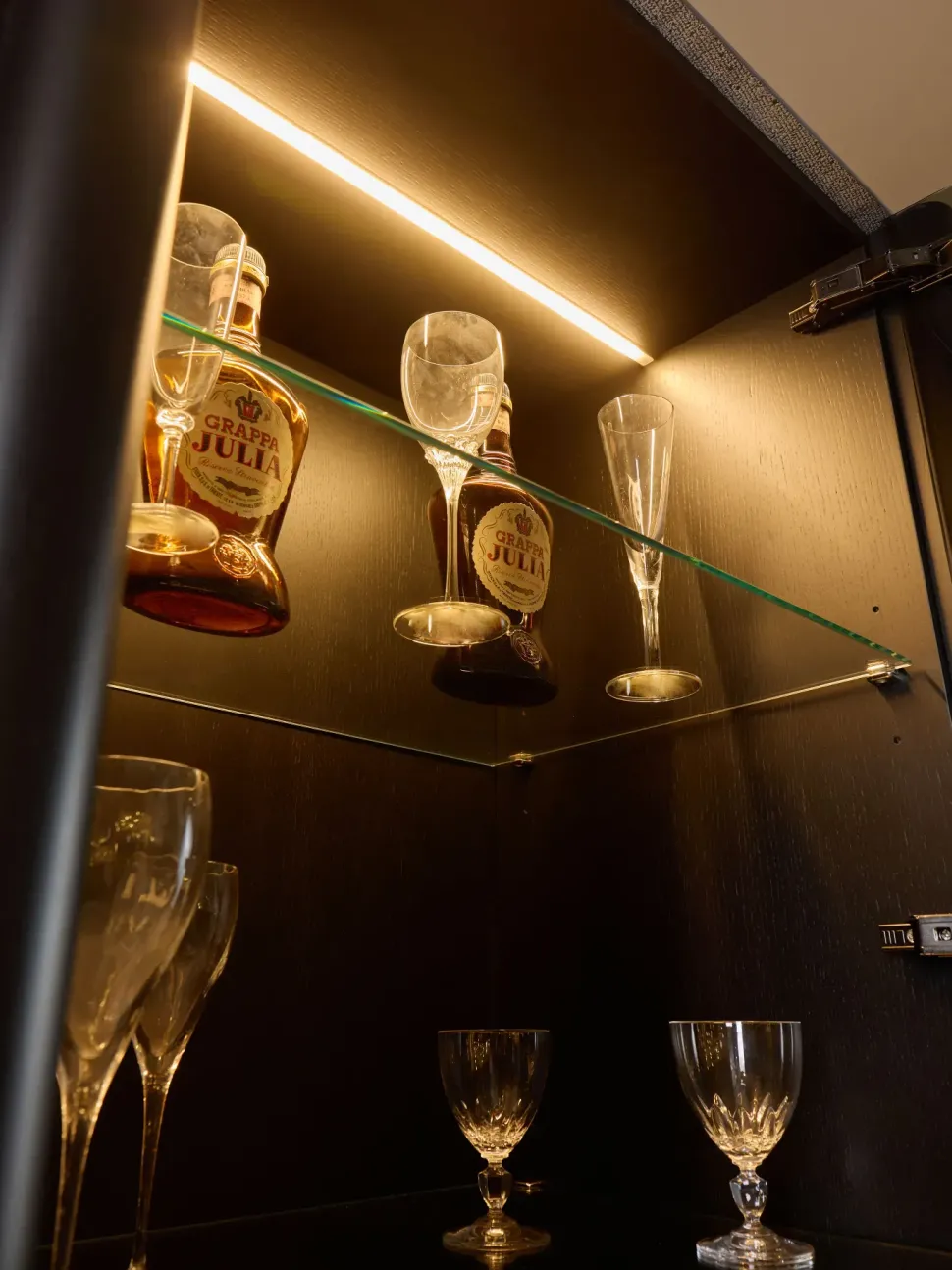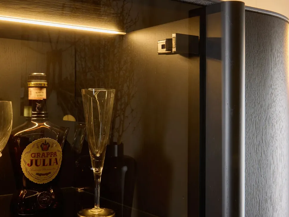 Al centro, un anta in vetro fumé lascia intravedere la cristalleria, valorizzata da una luce LED integrata che illumina il vano centrale, creando un raffinato gioco di trasparenze. Le due ante laterali, prive di spigoli, celano vani pratici per riporre tutto ciò che si desidera tenere nascosto, mantenendo ordine e pulizia visiva.