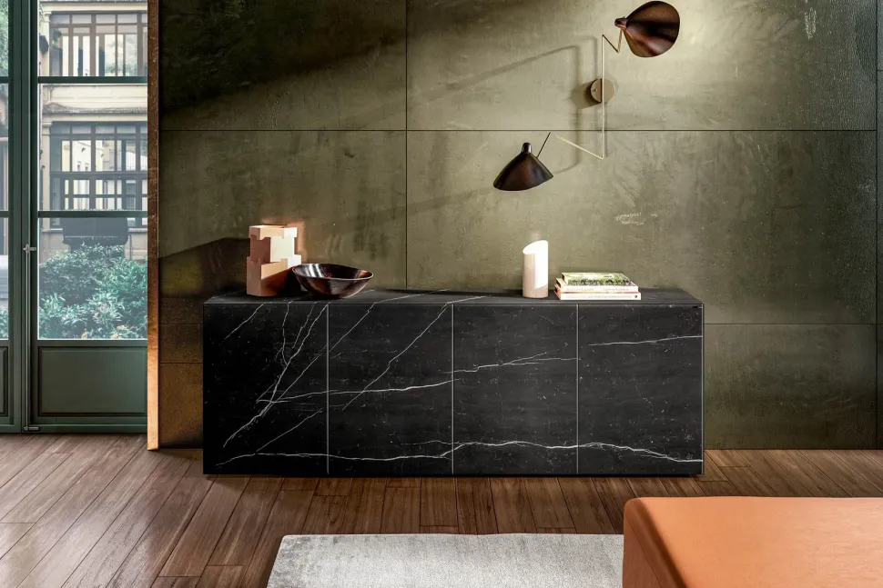 L’affascinante madia Materia si caratterizza per un effetto monolitico unico dato dalla particolare finitura in vetro XGLASS, che con la propria continuità di venatura, crea un effetto naturale simile al marmo. Materia è allo stesso tempo elegante e resistente e regala emozioni grazie a meravigliosi riflessi di luci dati dal vetro.