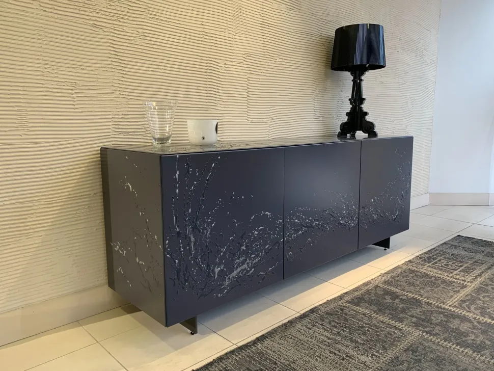Decorazione artistica su ante, top e fianchi con resina colore argento.