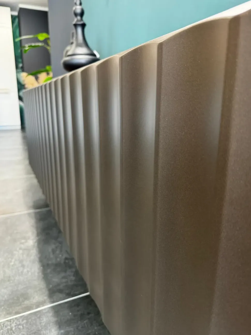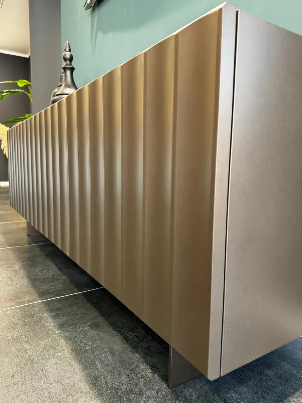 Il design di questa credenza è caratterizzato da solchi verticali sulle ante, che spezzano la linearità della parete su cui è appoggiata creando movimento e dinamicità. Disponibile in diverse dimensioni, la madia è realizzata in legno verniciato nelle finiture bianco, bronzo o piombo. La base può essere scelta con due piedini per un effetto visivamente più leggero o a zoccolo per una figura più compatta.