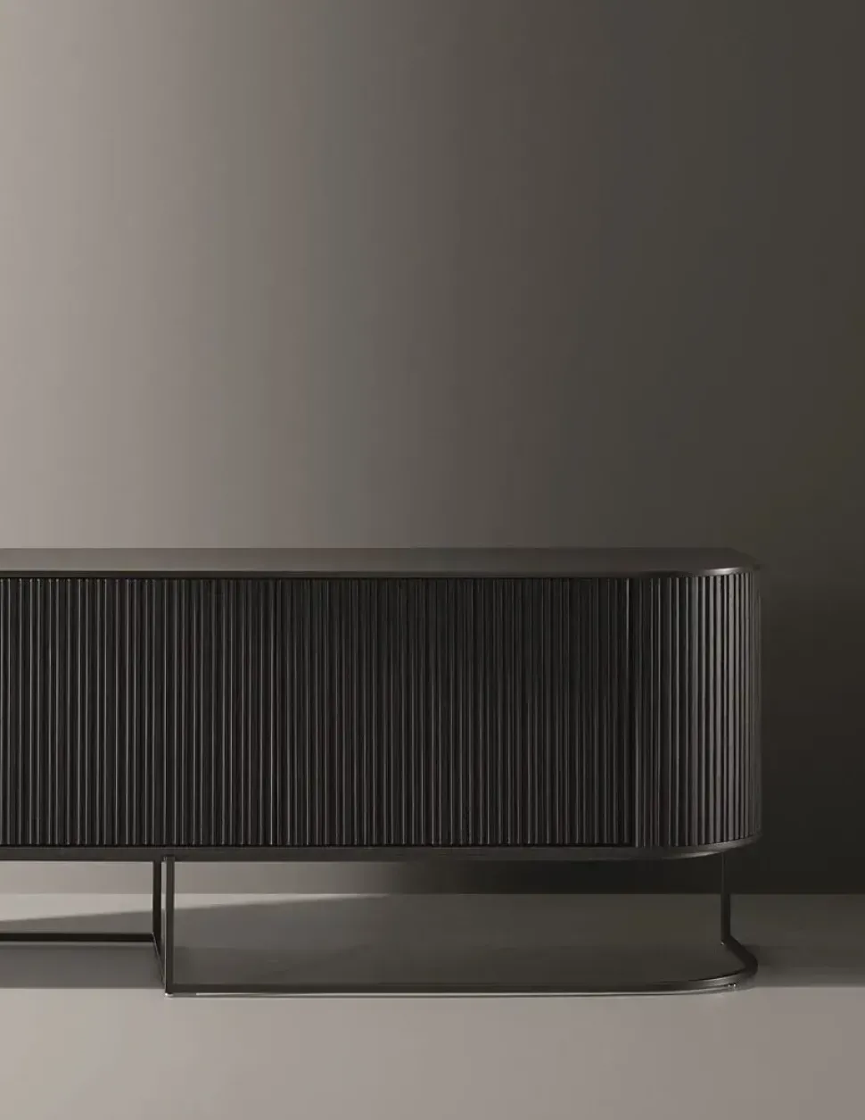 Madia mod. DUNE struttura laccata frontali in Noce Canaletto o Rovere Carbone .Piedi in metallo laccato Bronzo o Piombo .ante battenti apertura push. L. 205x48prof.x70 H.