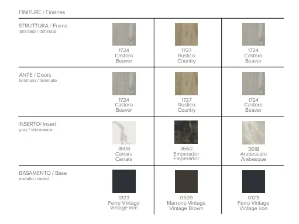 GIUNONE è adatta su diversi arredamenti (comprendenti tutti i range possibili dal classico al moderno) soprattutto grazie a tutte le finiture personalizzabili a disposizione: la struttura e le ante possono essere predilette con effetto legno castoro, rustico o rustico bianco, mentre gli inserti in gres si possono scegliere tra effetto marmo di Carrara, Emperador, o Arabescato. Per un abbinamento consigliato con i prodotti del catalogo Target Point, tra le opzioni migliori ci sono sicuramente il Tavolo VORTICE, le sedie BELLINZONA ed il tavolino TRASLO.