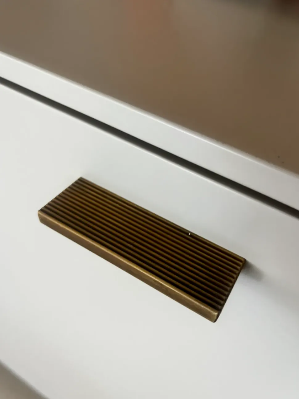 Madia a terra laccato opaco grey con maniglie bronzo e supporto bronzo. Composta da 2 ante con 1 ripiano interno per vano e 2 parti a cassetti. L 218 cm H 74,5 cm P 47,6 cm.