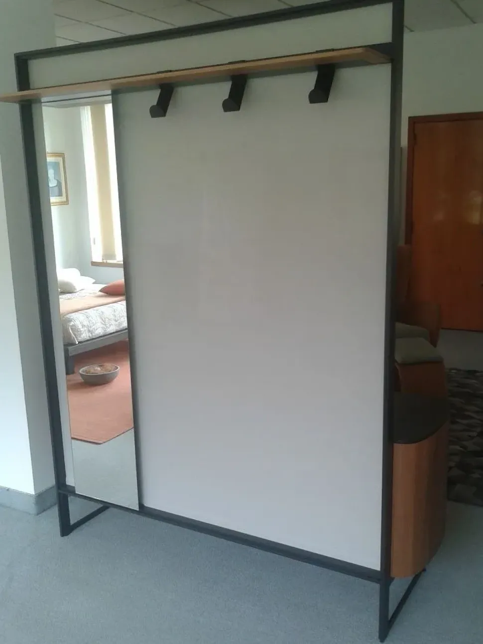 il tutto è posto sopra una panca in metallo laccato nero stout e prevede un divisorio con telo e specchio con mensole ad uso appendiabiti ingresso, puo fungere anche come divisorio.