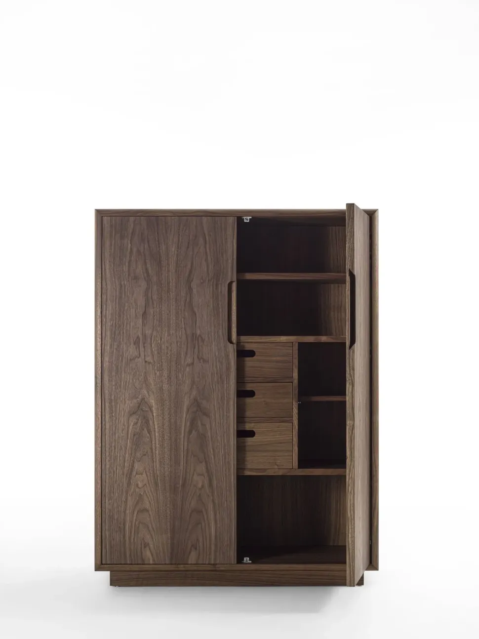 Madia alta in legno massello e listellare di noce finitura olio. Due ante a battente con maniglia incassata e sagomata; interno con due ripiani e tre cassetti assemblati con incastri a coda di rondine. Struttura con bordi stondati. Dimensioni L.113xP.50xH.150cm