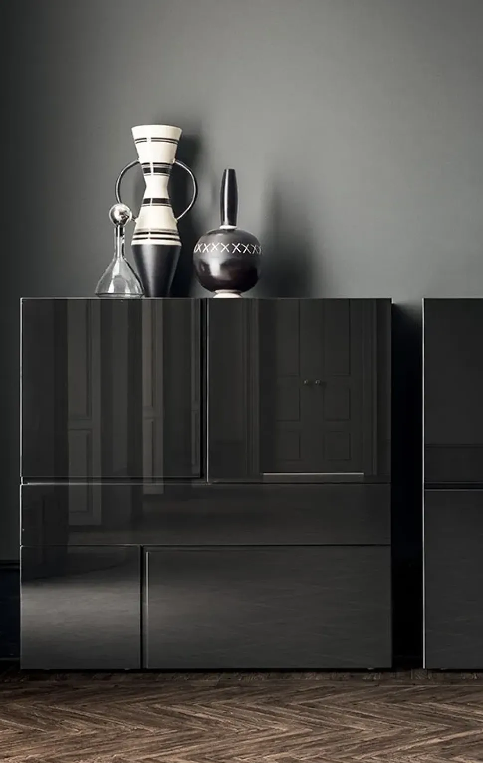 La madia Quadra è disponibile anche in Laccato Lucido Spazzolato oppure in Essenza.