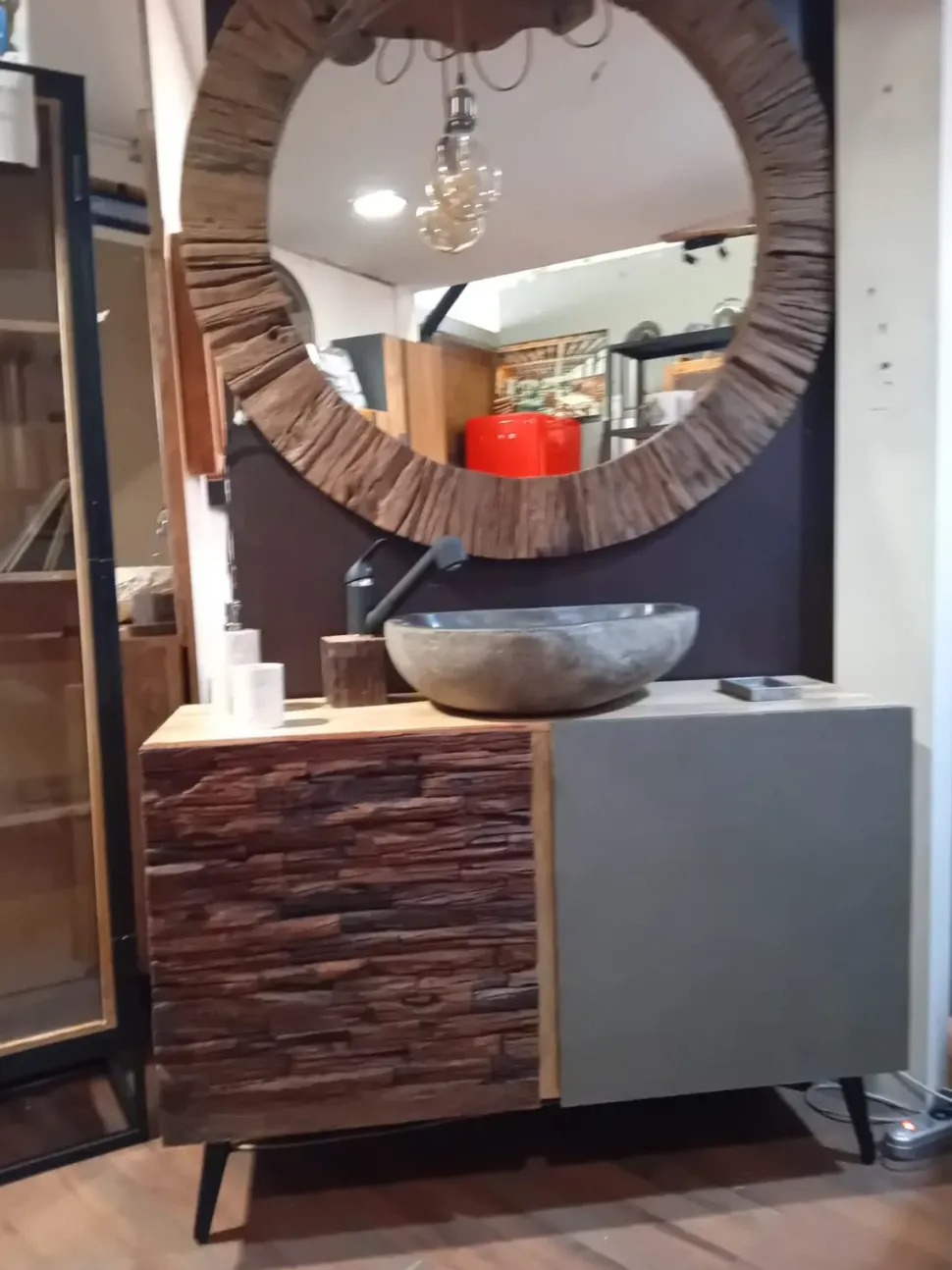 mobile bagno industyrial in vero legno di palissandro e tak con ante in legno dark wood e effetto stone