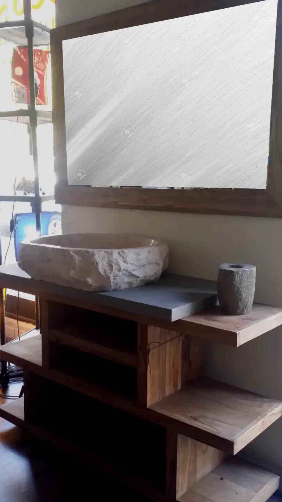 Mobile bagno etnico light beolo in legno etnico iroko con lavabo in pietra granito colore beige white eco il mobile in noce indiano di sessham wood in offerta super convenienza realizzato artigianalmente in india con studio made in italy la consolle del mobile e di misura cm 120 x 40 h 75 si compone poi il mobile arredo bagno di un piano di lavoro in smile cemento piano impermeabile adatto appunto a superfici da bagno abbiamo poi nella composizione mobile bagno etnico light beolo in legno etnico iroko con lavabo pietra granito beige white il mobilein legno di sessham wood in offerta super convenienza il mobile si compone aqppunto di essere bifacciale ed avere dei ripiani aperti sui lati da creare un effetto leggero ma robusto dovuto al legno masello un bello specchio in stile etnico industrial con scritte su botti di legno da cm 120 x 80 vendiamo on line in tutta italia con consegna e spedizione in tutta italia prezzo a parte