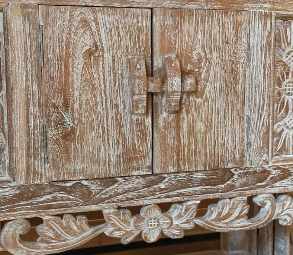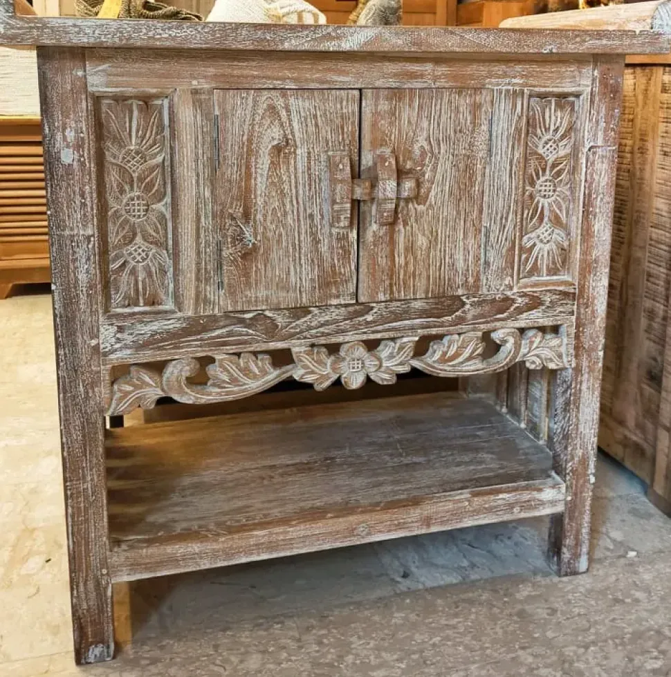 Mobile Consolle Bagno Teak Decapato , Mobile etnico orientale realizzato artigianalmente in Teak massello riciclato e intagliato a mano con motivi floreali.
