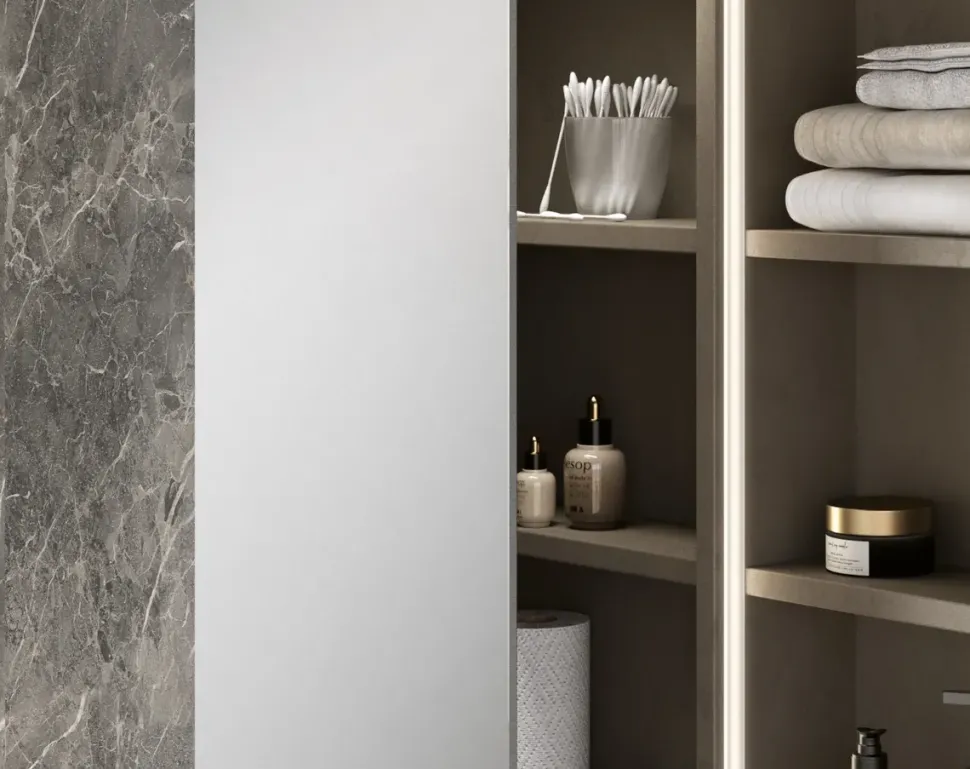 Titus è attrezzato con ante a specchio bifacciale, ottime per potersi specchiare anche di profilo. L’anta è composta da due specchi accoppiati.