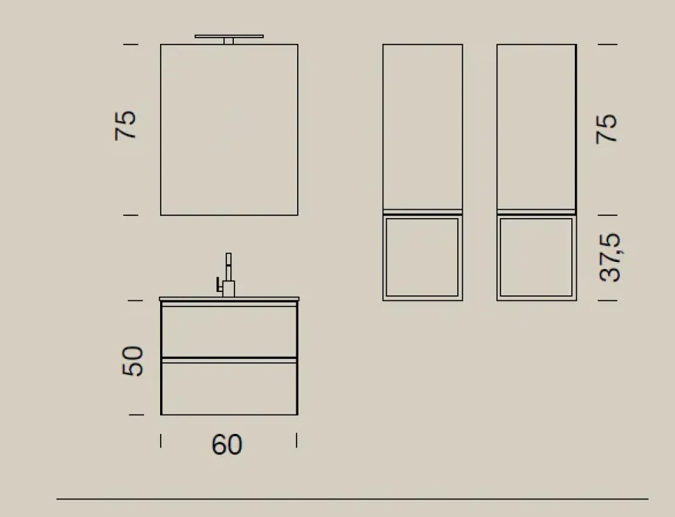 La base portalavabo, oltre alla misura base di 60 cm, è prevista anche nelle seguenti misure: 85 cm, 95 cm, 120 cm (per conoscere i relativi prezzi contattateci).
