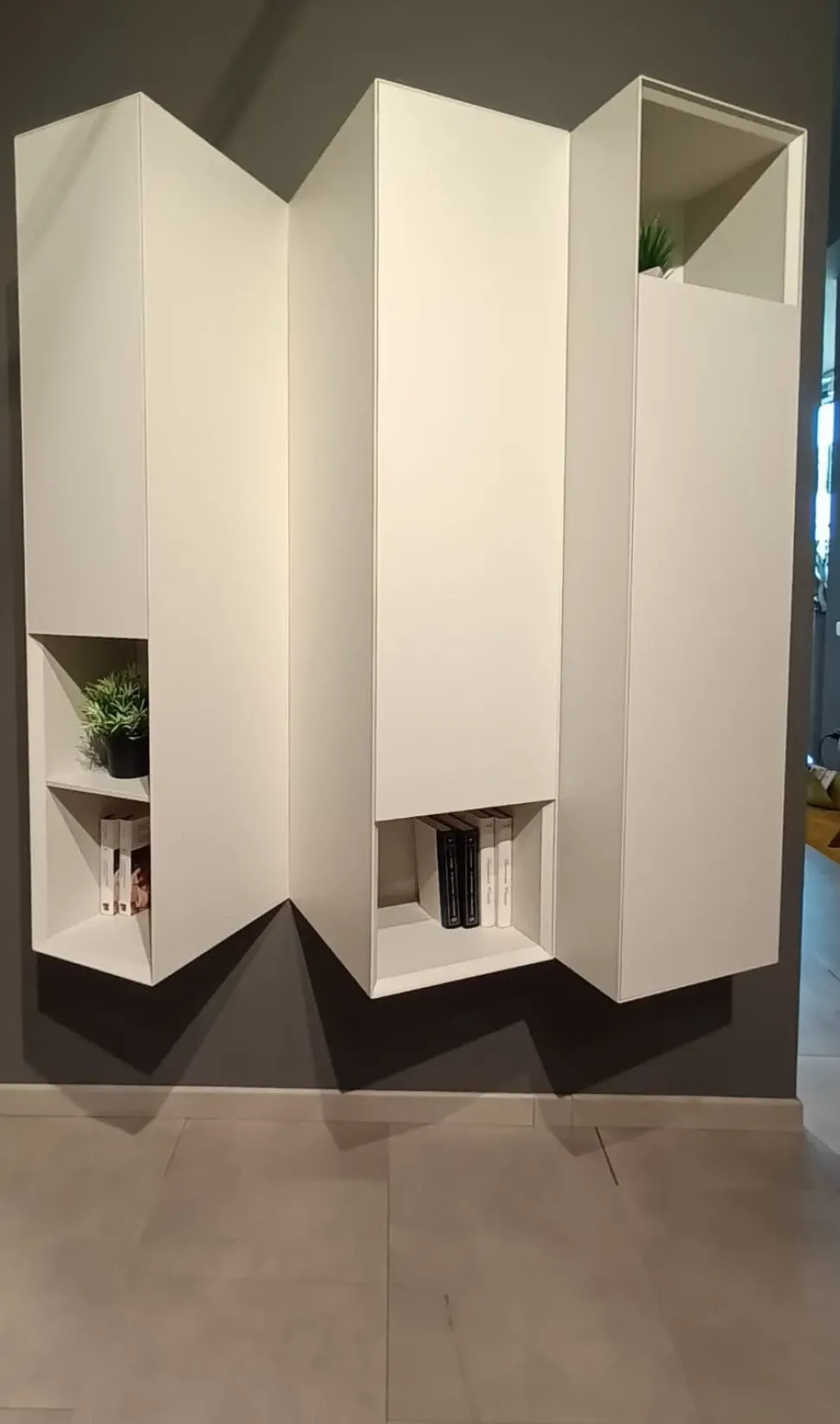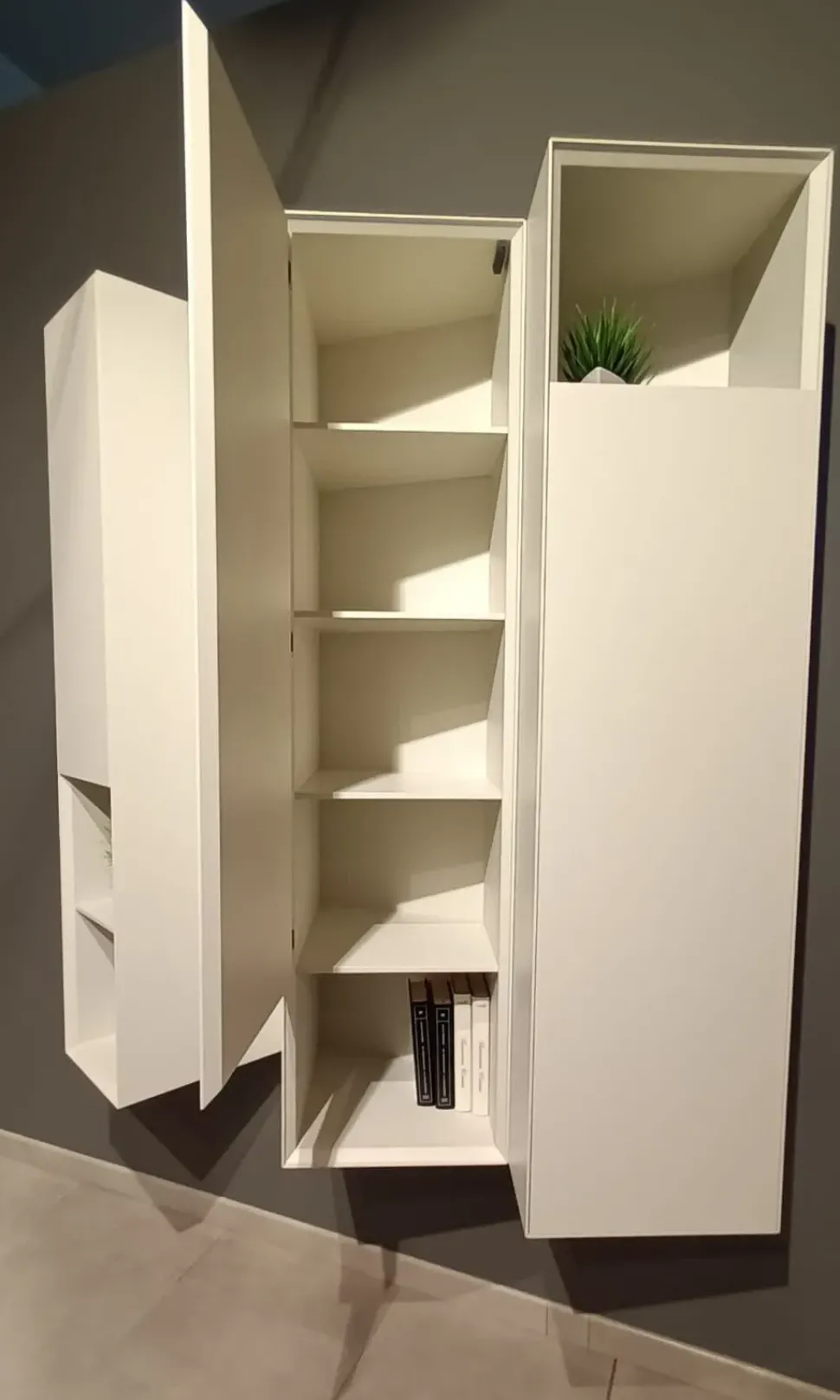 Pensili con larghezze asimmetriche, conferendo un aspetto originale e dinamico. Laccato opaco magnolia.