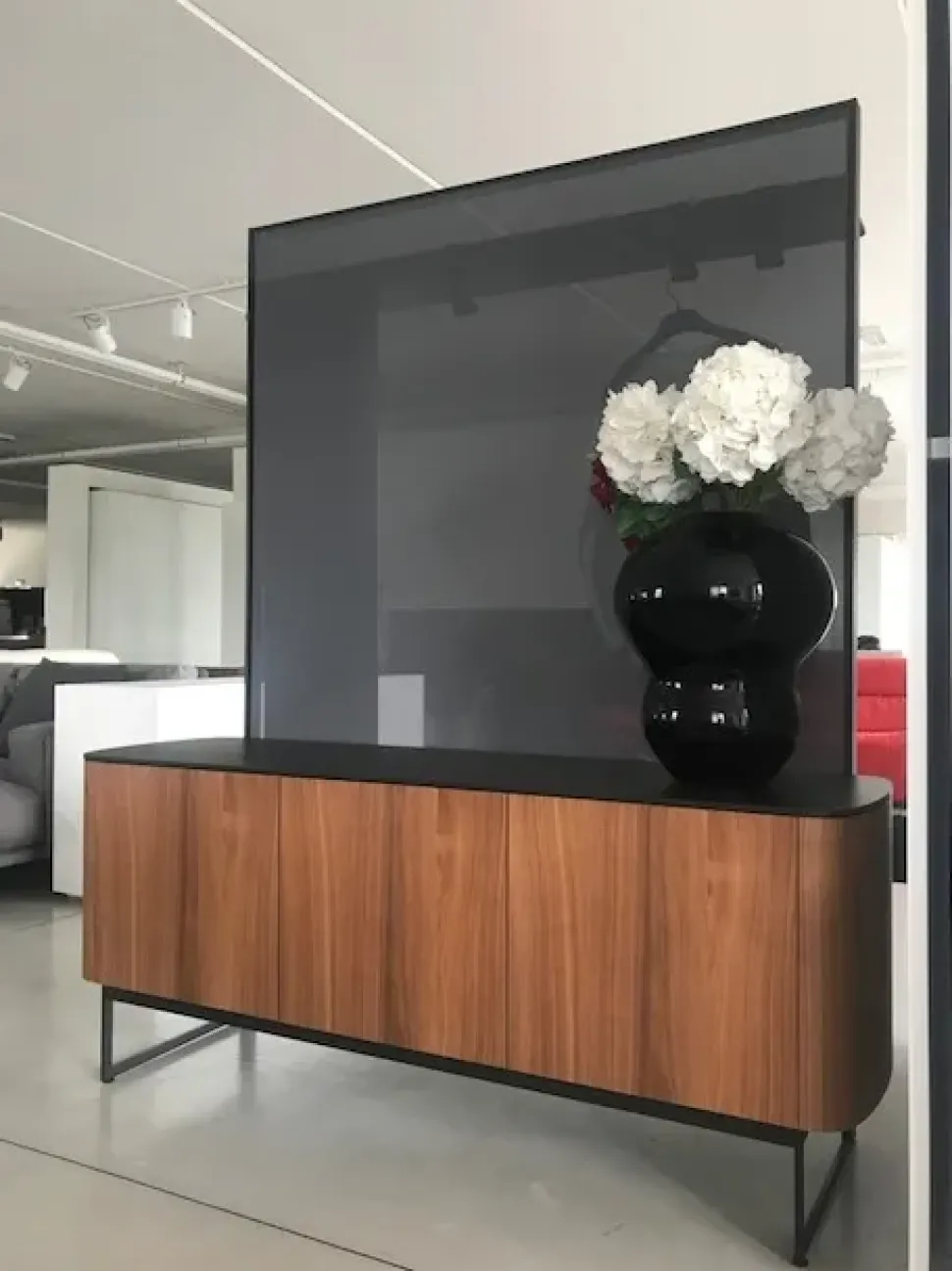 Il telaio dell’alzata del mobile è in alluminio laccato nero, con telo screen grigio pietra.