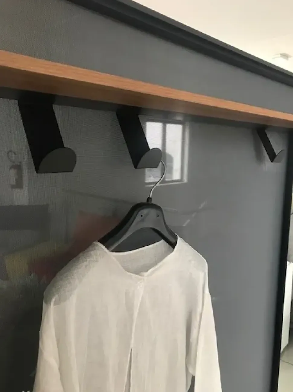 La parte opposta alla madia è composta da mensola superiore in noce canaletto, specchio verticale e appendi abiti spostabili.