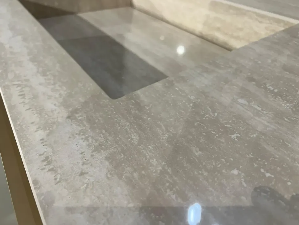 Il top, spesso 1,5 cm, è realizzato in Florim Travertino, un materiale noto per la sua eleganza e durabilità. La