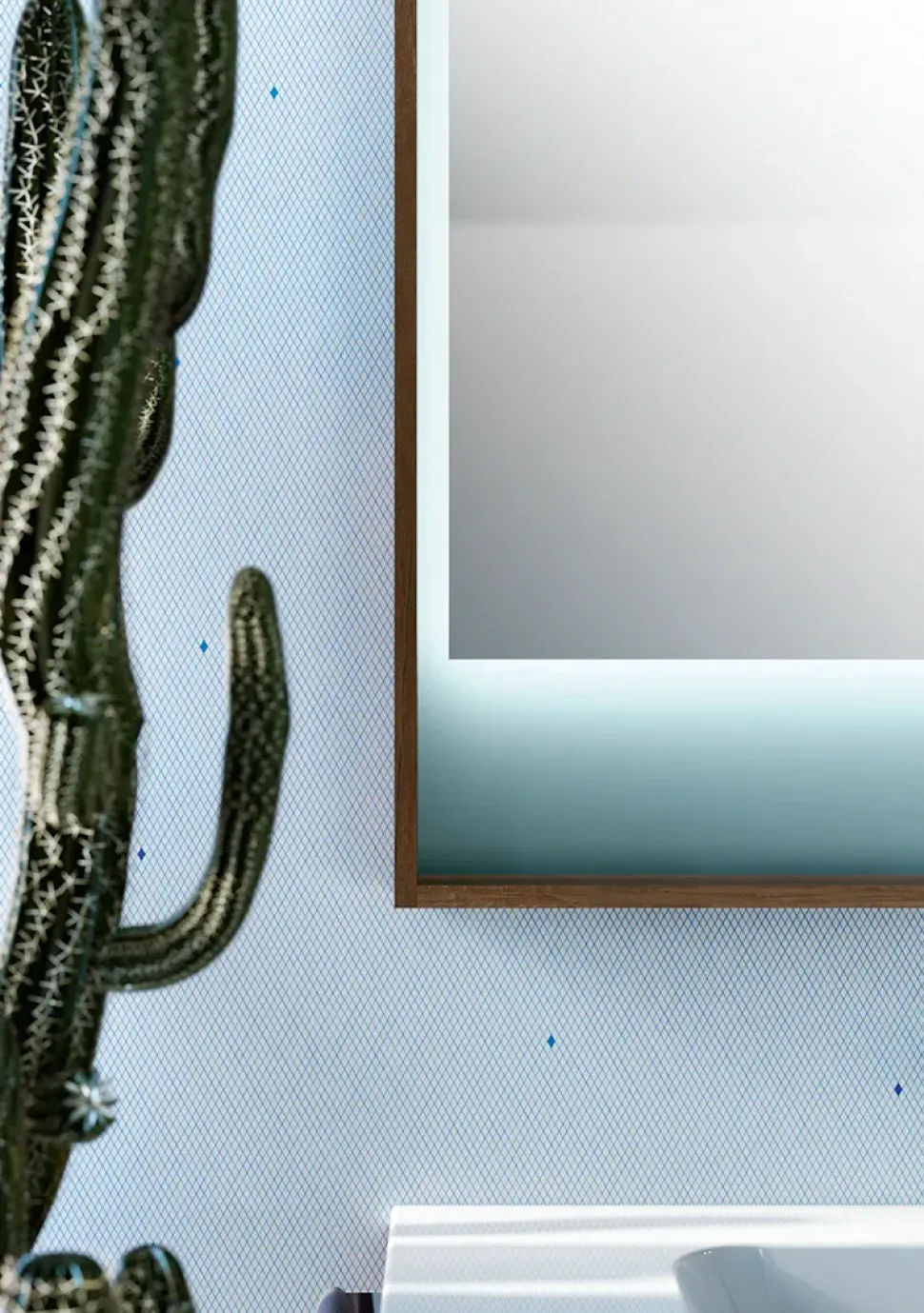 Gioia è uno specchio dalla grande personalità, grazie alla retroilluminazione che rende tridimensionale lo specchio rispetto al fondale in color Avio, creando effetti di design davvero suggestivi.