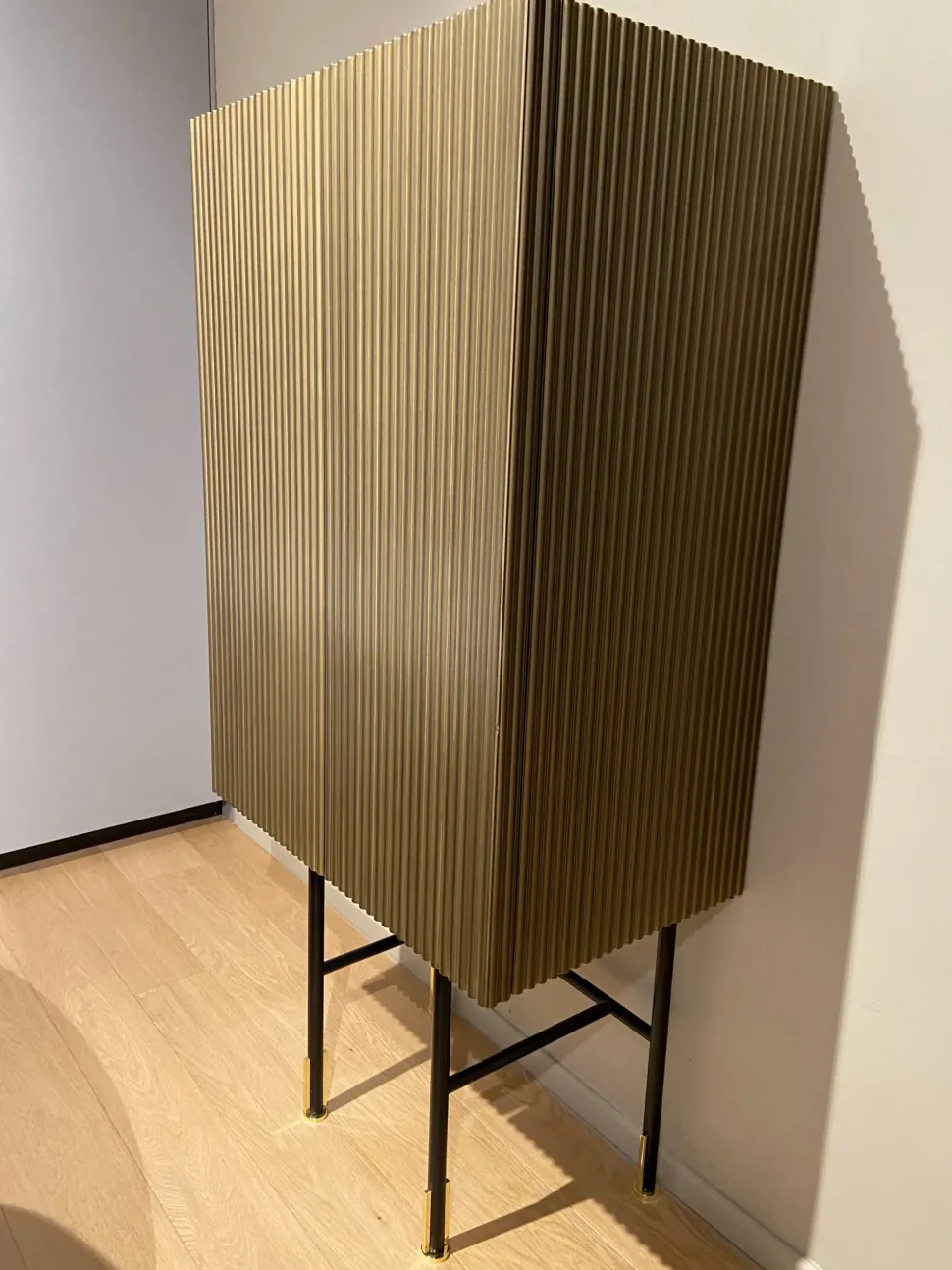 Aero è un elegantissimo mobile bar a due ante con finitura ottone vintage ed interni salvia. I colori e la trama verticale rendono questa elegantissima madia una reinterpretazione in chiave moderna dei mobili bar anni ’30. La struttura interna è pratica e contenitiva e permette di posizionare con grande agio bottiglie, vassoi e bicchiere di qualsiasi dimensione. Un articolo perfetto per stupire, con eleganza e praticità, i vostri ospiti. dimensioni: Larghezza 73 cm – altezza 152 cm – profondità 45,5 cm