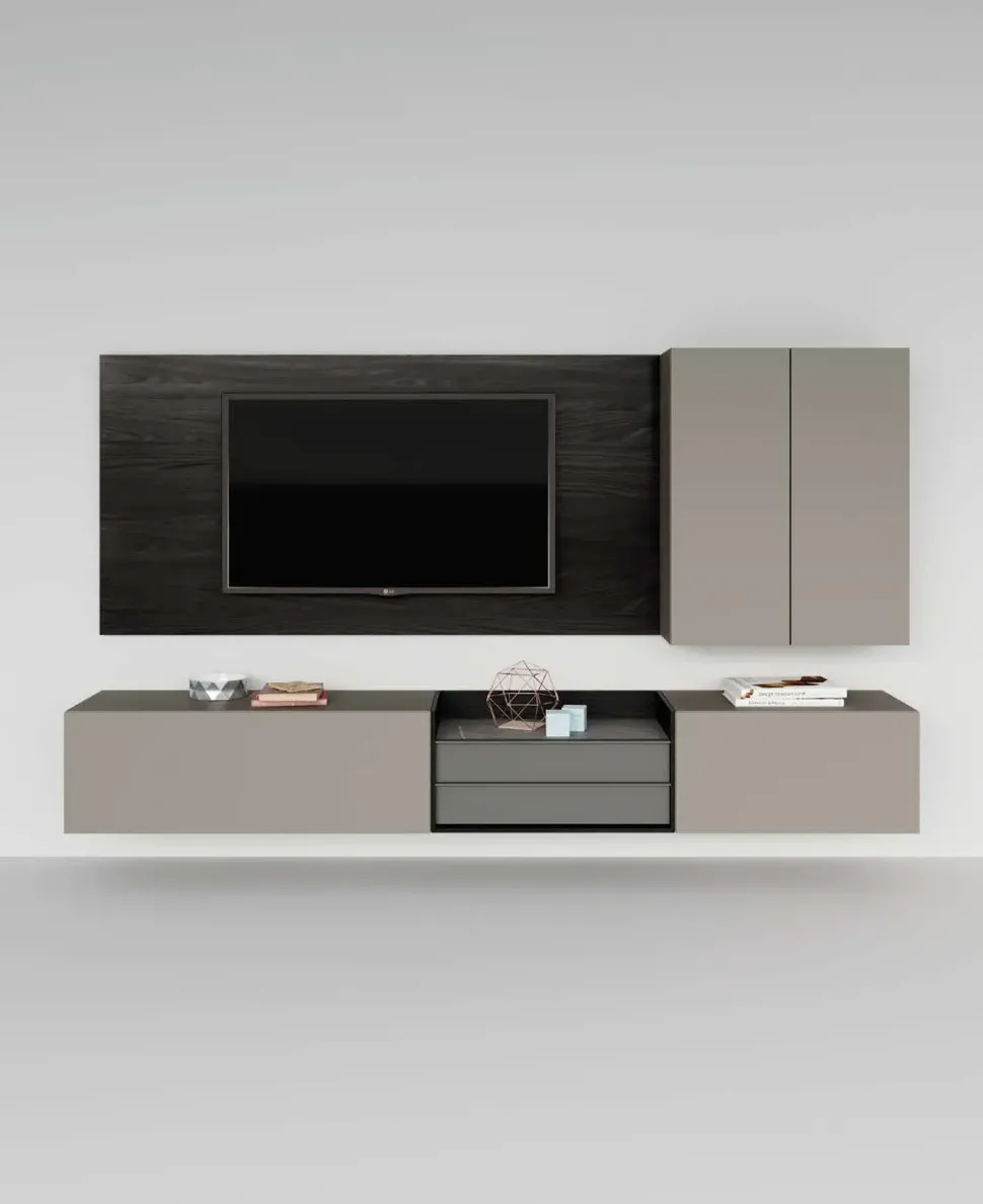 Produzione artigianale di altissima qualità con finiture di pregio- La composizione è in finitura laccato opaco dentro e fuori. Il pannello dietro la TV è in finitura materica olmo legno ed il top della cassettiera è in grès di marmo grigio.
