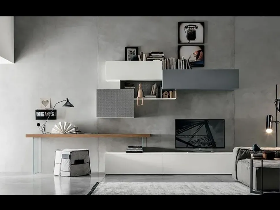 - Per impreziosire un living design opta per una parete attrezzata che mantenga una certa idea di stile, come questo modello Composizione a054 a prezzo ribassato.