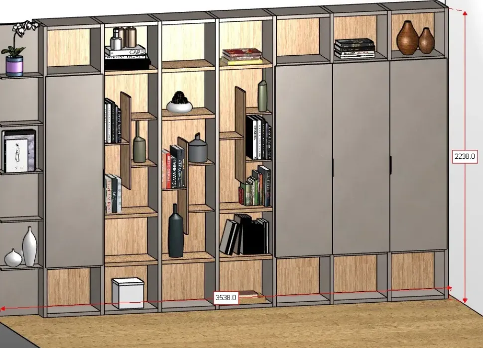 Le linee essenziali e la palette cromatica neutra tra il grigio caldo e il tortora rendono la parete libreria una scelta ideale per ambienti moderni, minimal e di classe.