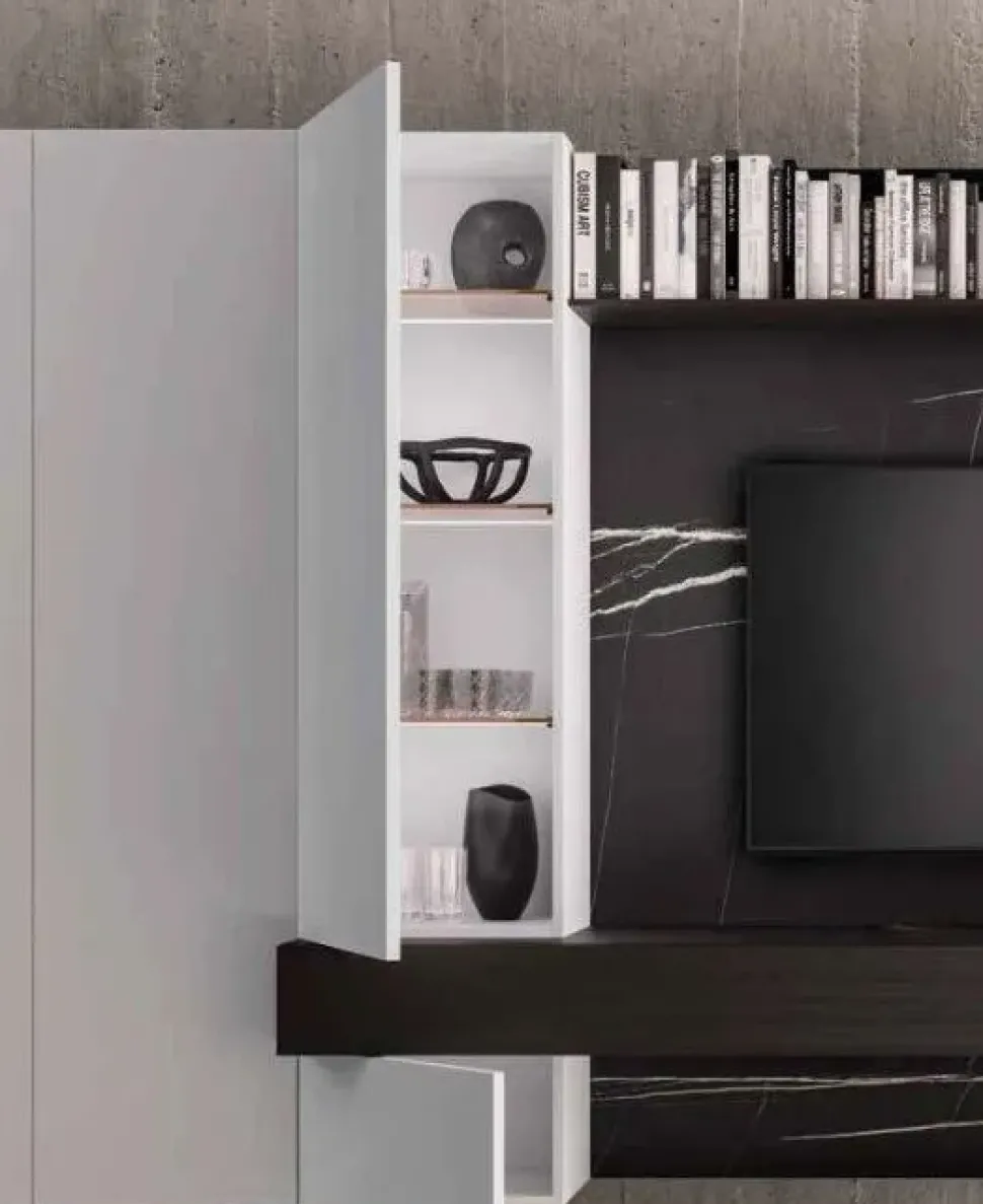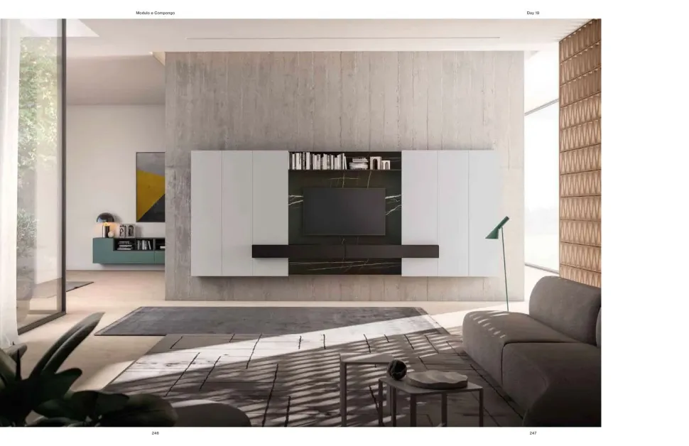 Esempio di soggiorno Day 19 al prezzo esposto come da foto, pensili in materico Seta, cassetti materico Carbone, boiserie in melaminico marmo Tunisi, Misura L.4500 H.1800 P.350/478.