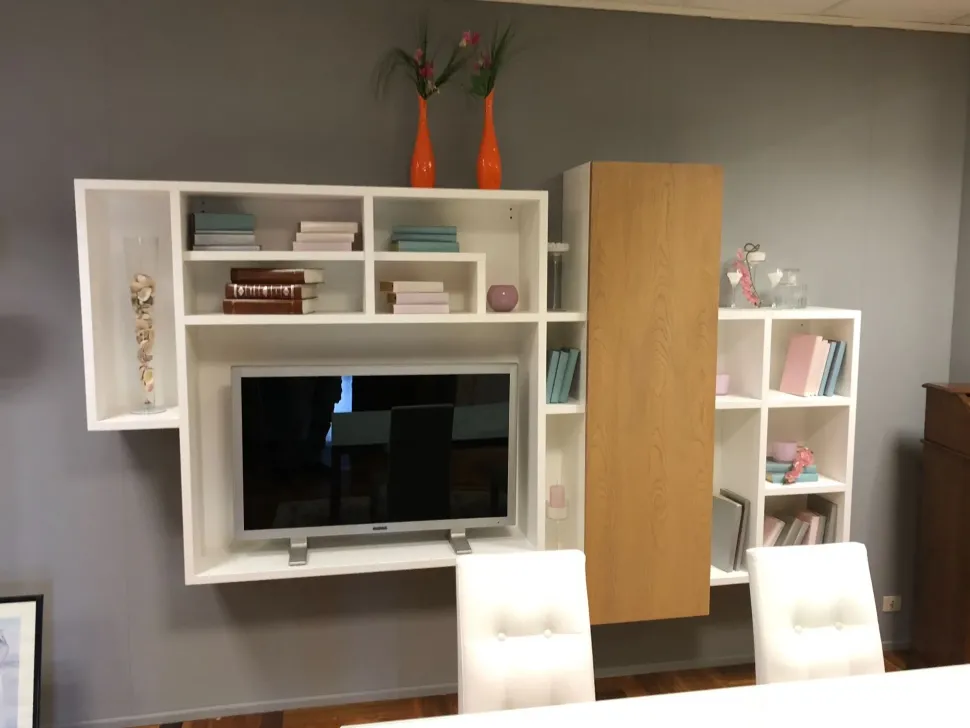 Parete attrezzata di design in legno listellare di rovere , laccata bianca con anta rovere naturale ,PRODOTTO DA ESPOSIZIONE L 270 cm H 170 cm P 33/35,5