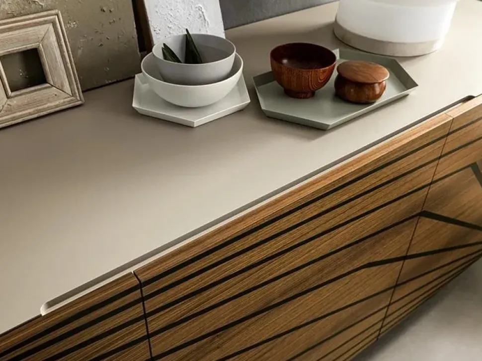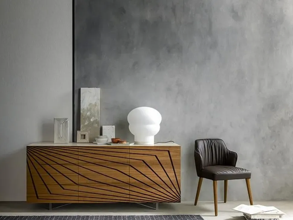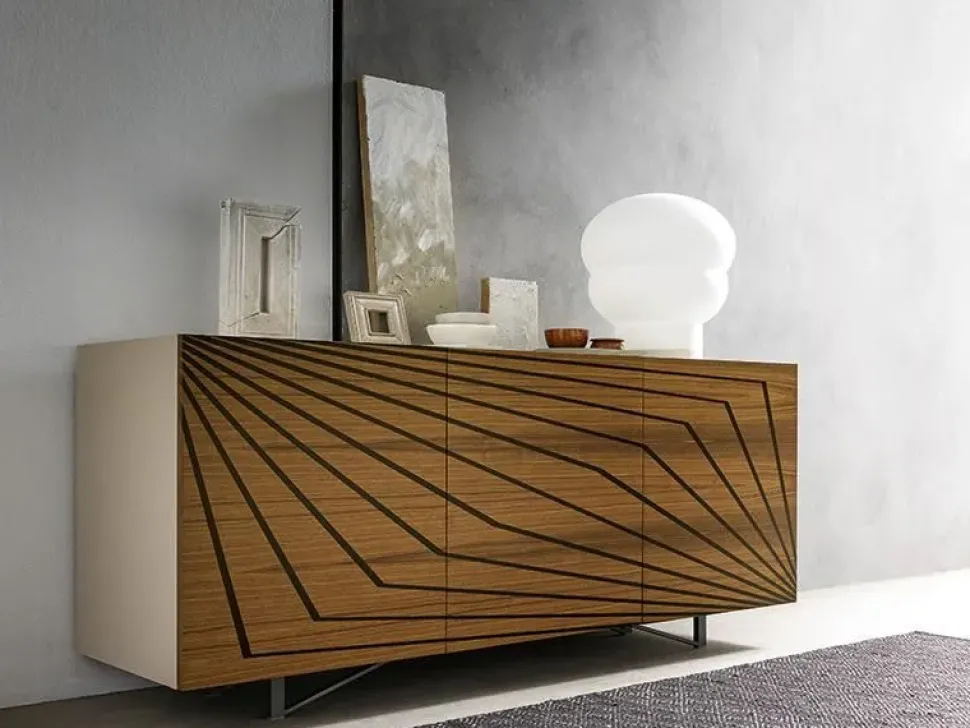 Optik è un complemento d’arredo davvero unico, le sue linee convergono nei punti esterni della madia formando un effetto ottico esclusivo realizzato da intarsi serigrafici. Composta da tre ante si presenta come un quadro astratto fortemente caratterizzante.