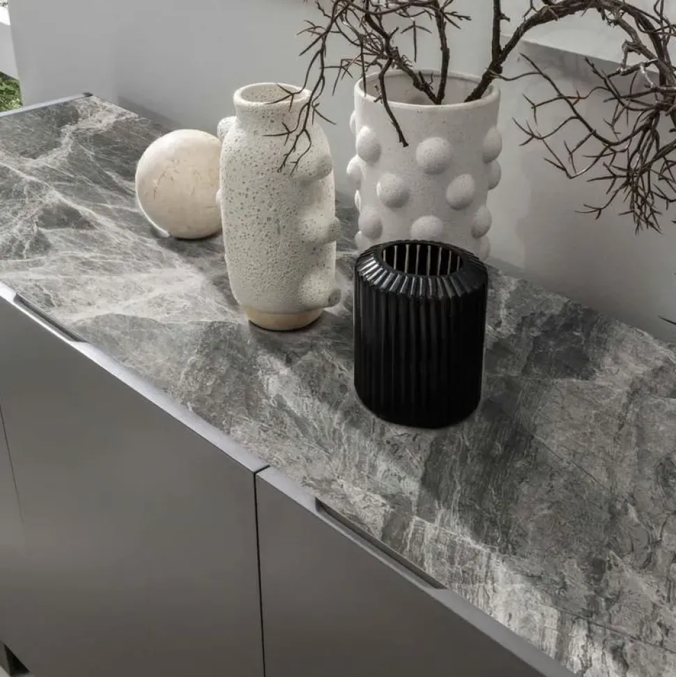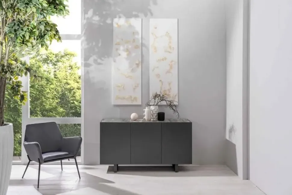 Linee decise e materiali di qualità: scopri la madia in laminato materico qui disponibile e potrai valorizzare il soggiorno.