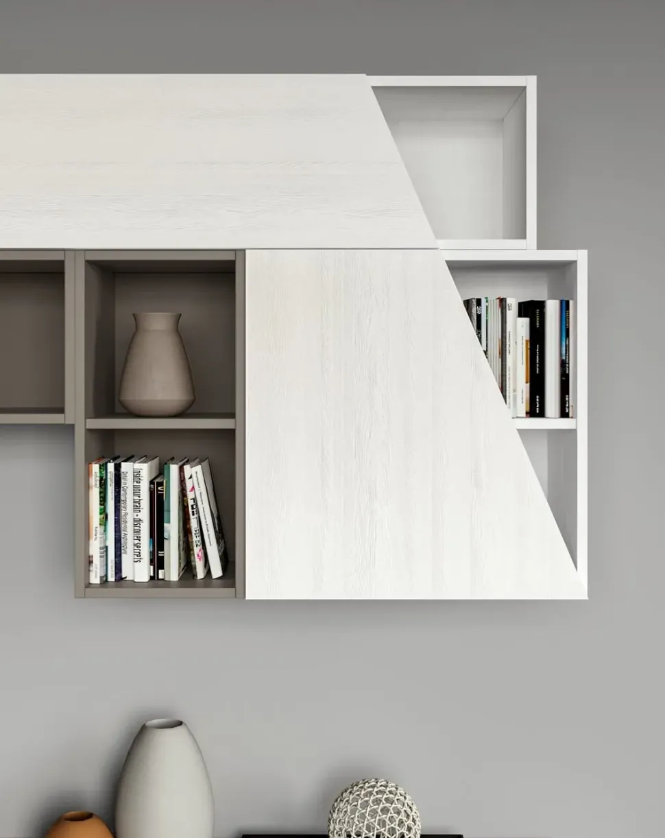 Living geometrico dove le linee dritte si alternano a tagli asimmetrici sui pensili, per uno stile giovane e dinamico. Il taglio asimmetrico sui pensili crea un gioco di spazi e volumi irresistibile, pensato per chi vuole vivere il soggiorno con uno stile moderno, non scontato. L’alternarsi di pieni e vuoti cattura lo sguardo dando forma a una configurazione decorativa e originale.