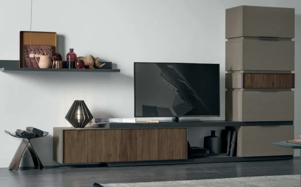 Per impreziosire un soggiorno design prediligi una parete attrezzata che mantenga una certa coerenza stilistica, come questo modello S002 a prezzo ribassato.