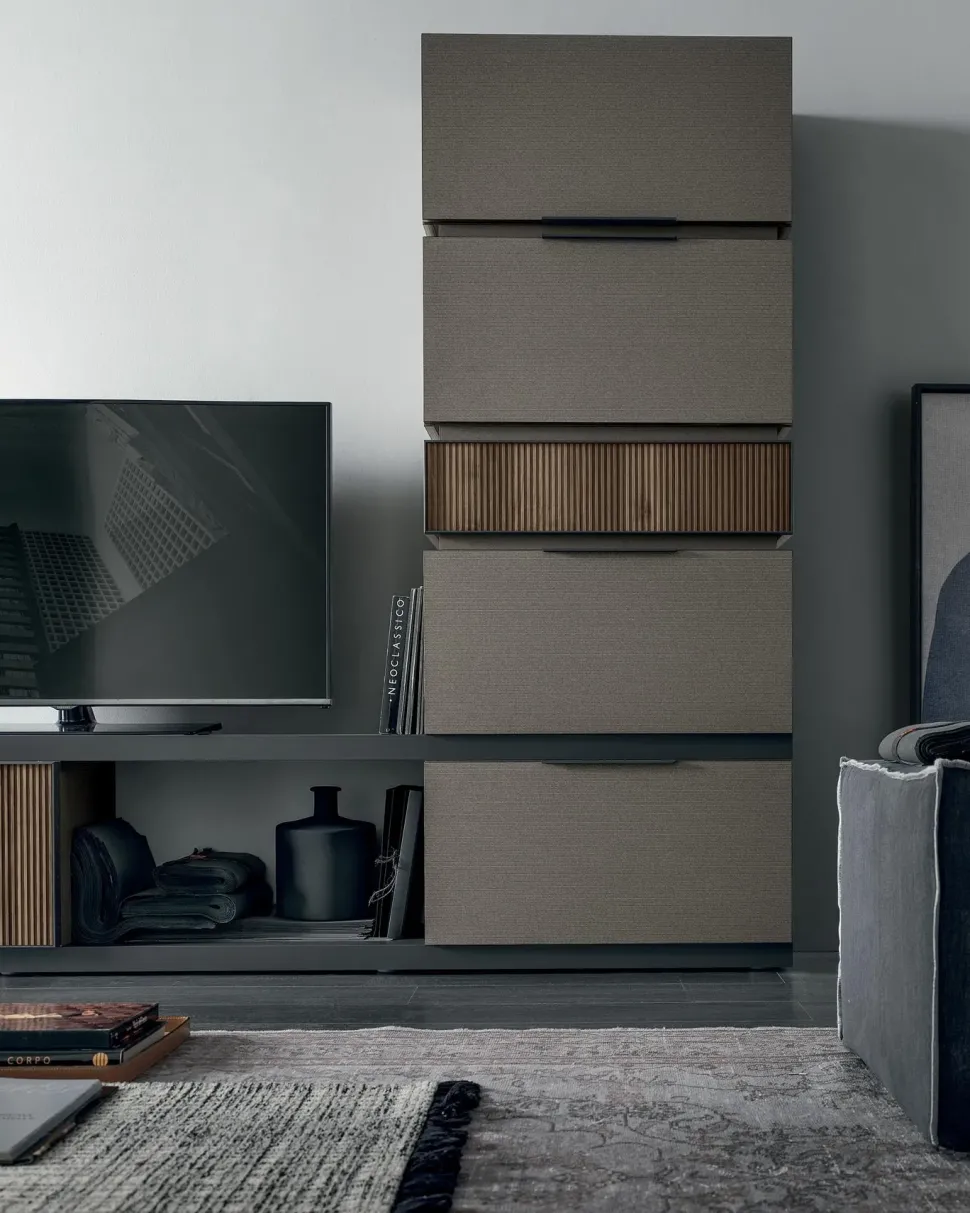 La multifunzionale e ampio parete attrezzata in foto è un mobile a terra che appartiene alla nostra linea di mobili e oggetti accessori di Tomasella, leader del settore.