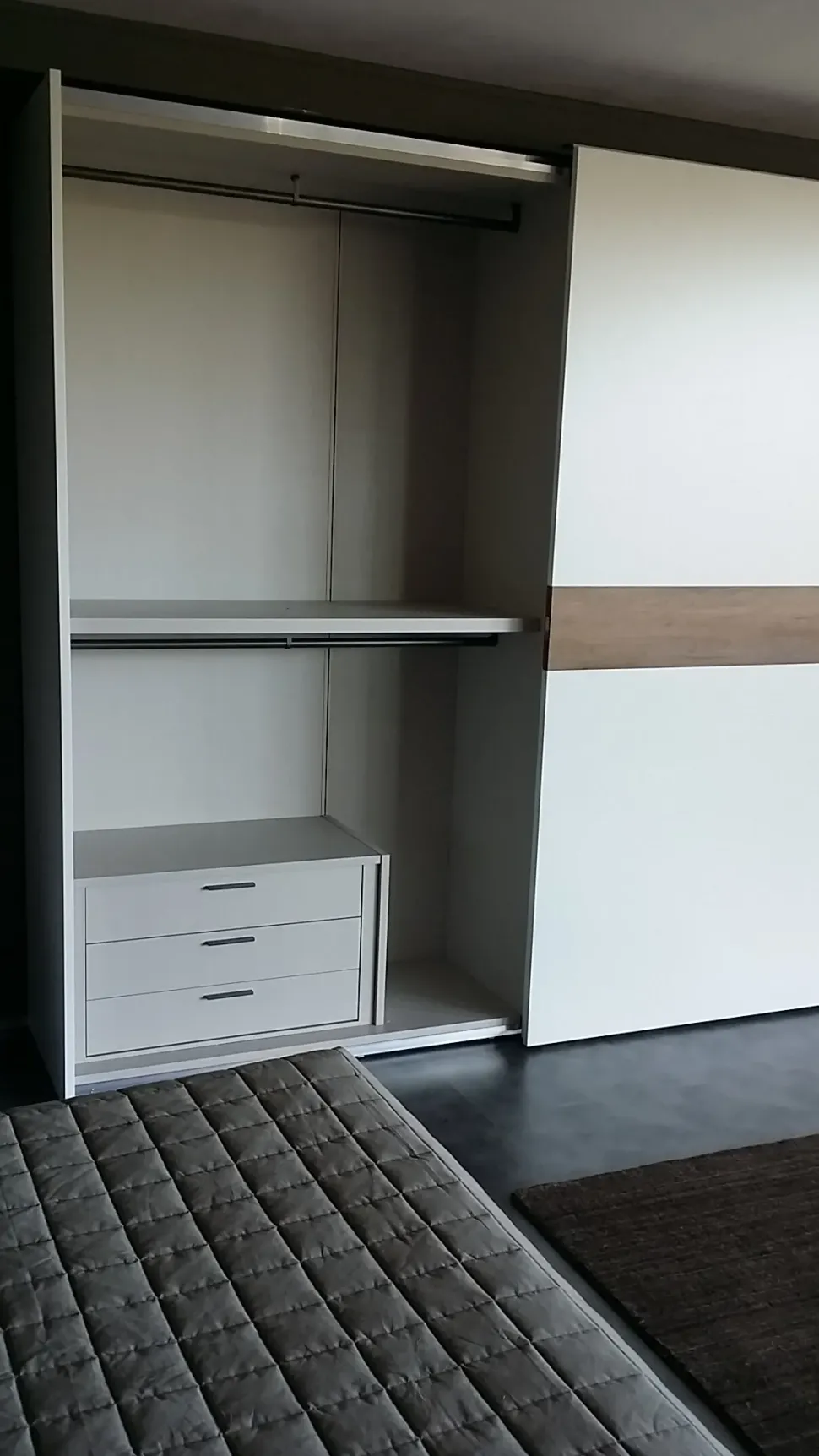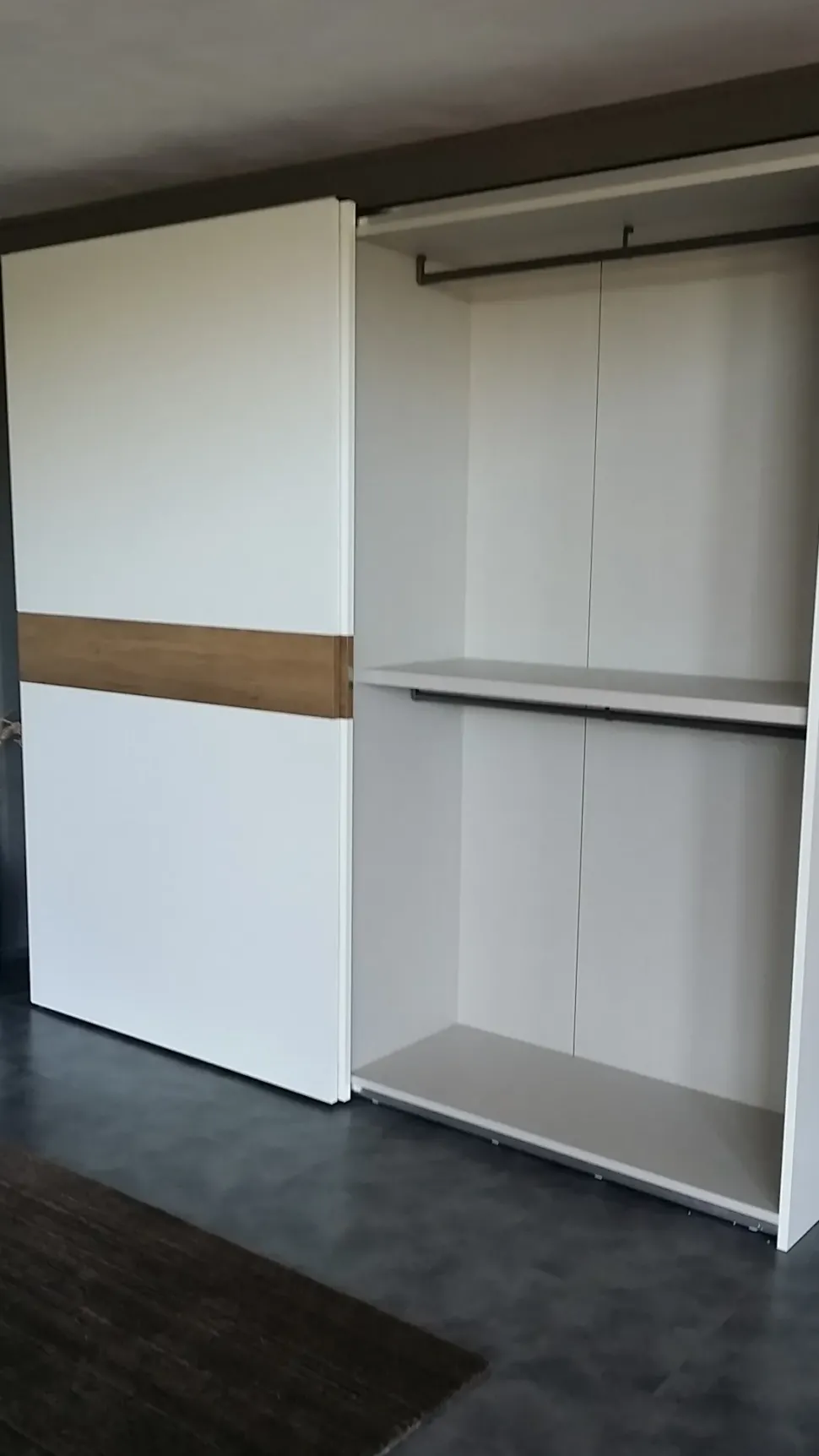– armadio a 2 ante scorrevoli in finitura mt. opaco bianco con inserto orizzontale in mt. nodato chiaro, struttura in tamburato con finitura interna in tramato, spalle spessore 25 mm., ripiani spessore 40 mm. attrezzatura interna : n.2 ripiani, n.4 tubi appendiabiti e n.4 cassetti, misure d’ingombro cm. 280x67prof.x258h.