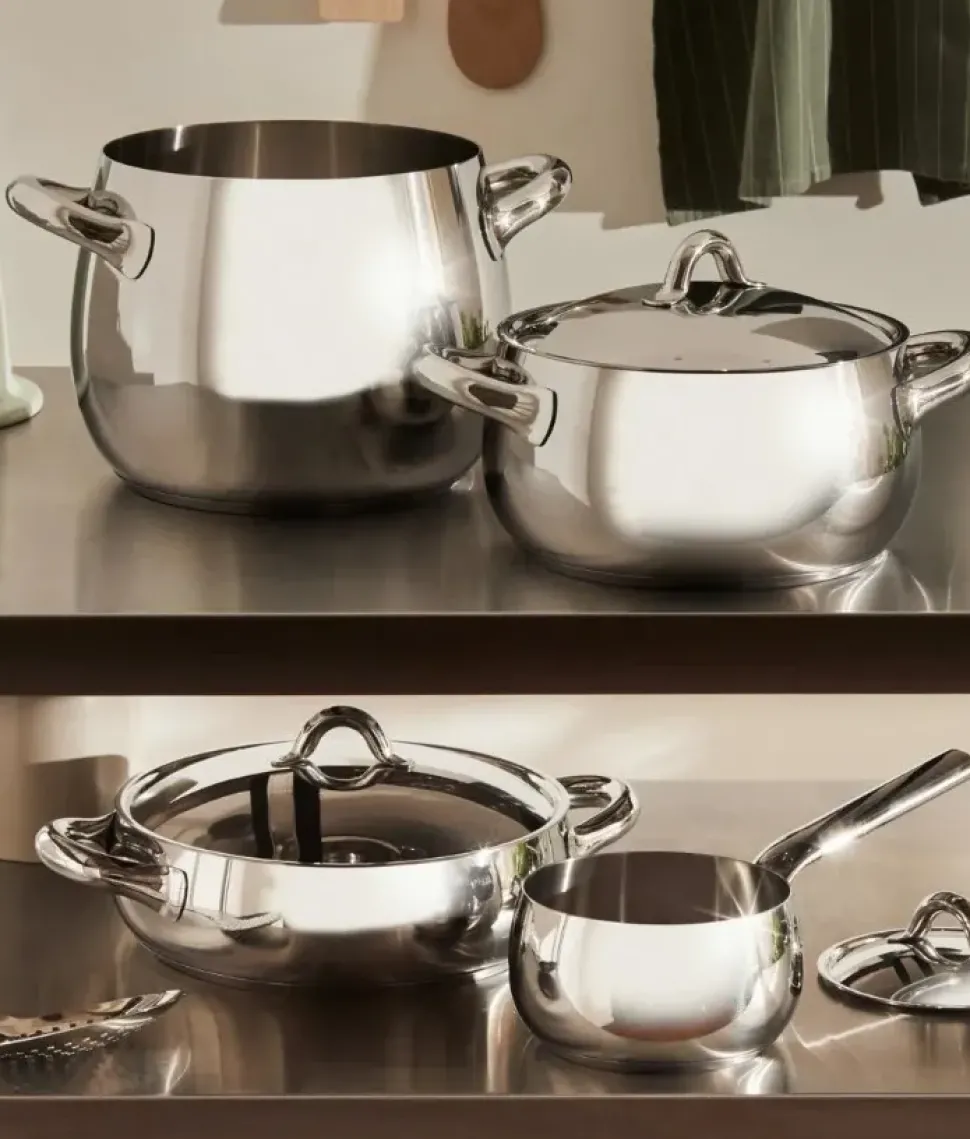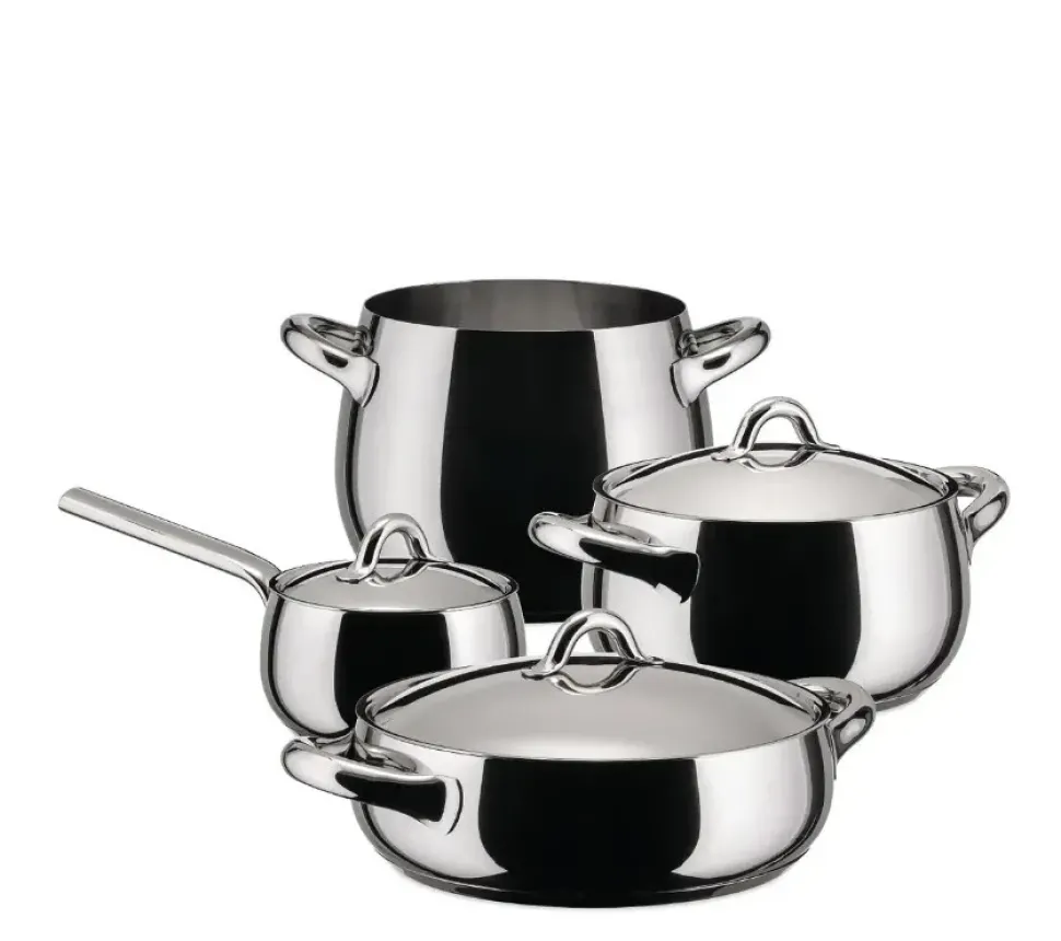 Le pentole della collezione Mami, create da Stefano Giovannoni, sono un inno alla forme morbide e panciute degli utensili della tradizione italiana da cui si diffondevano per la casa i golosi profumi del pranzo della domenica. Il set di pentole Mami è realizzato in acciaio inossidabile 18/10, con finitura lucida.