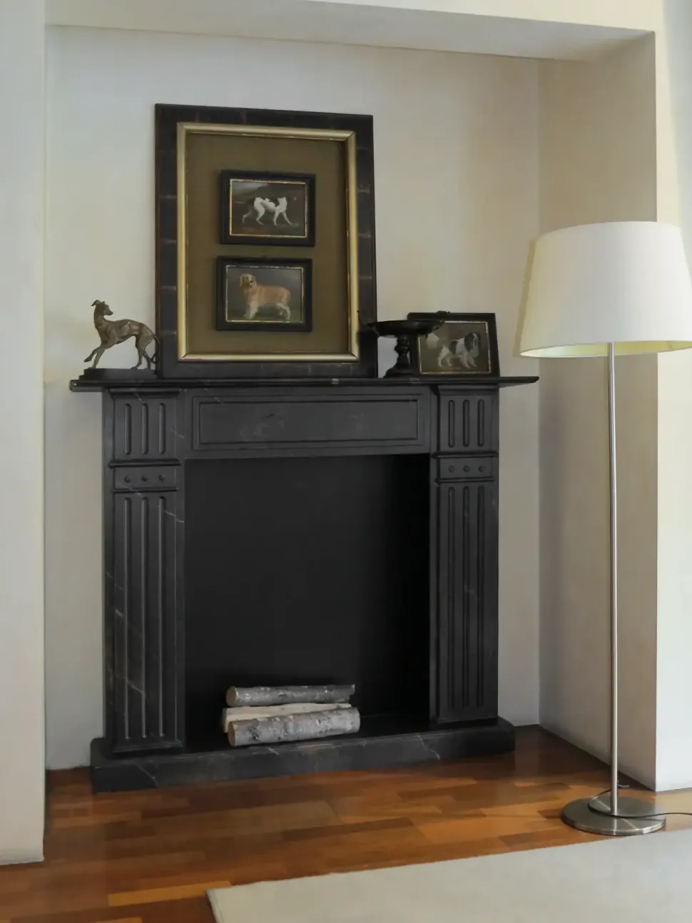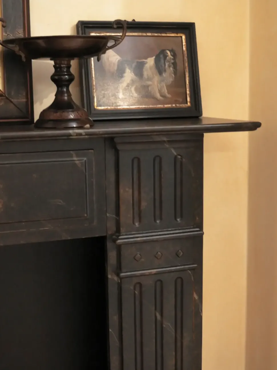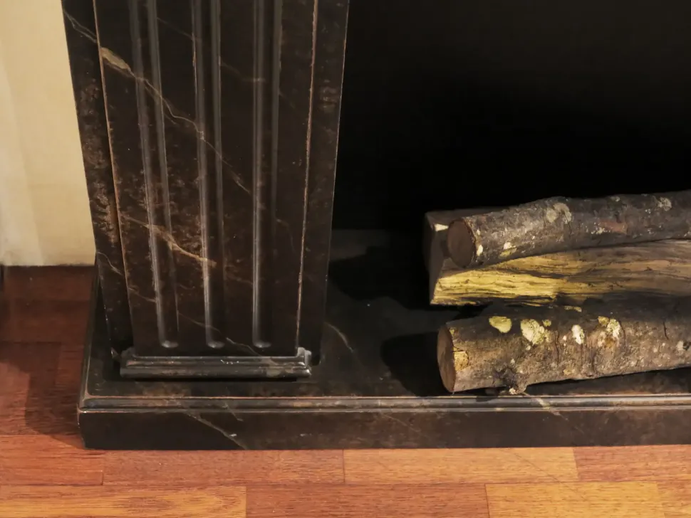 Camino decorativo in legno con finitura laccata effetto marmo.