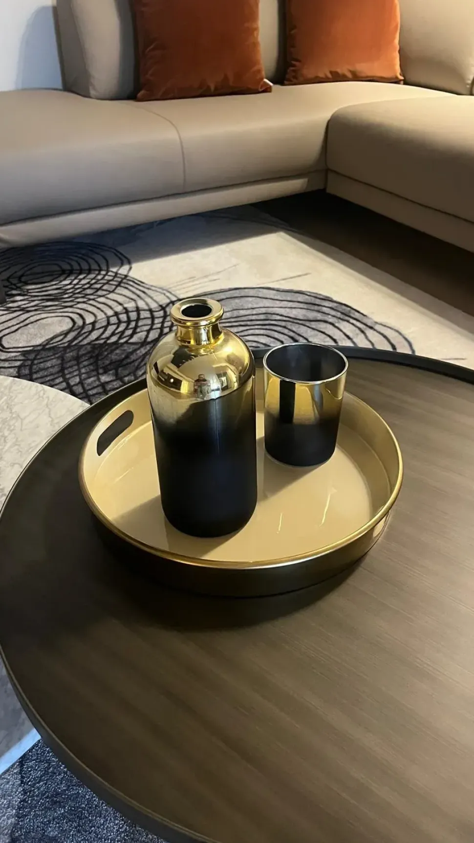 Vassoio tondo con bodi e manici, è color ottone con il fondo smaltato color crema