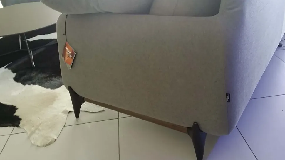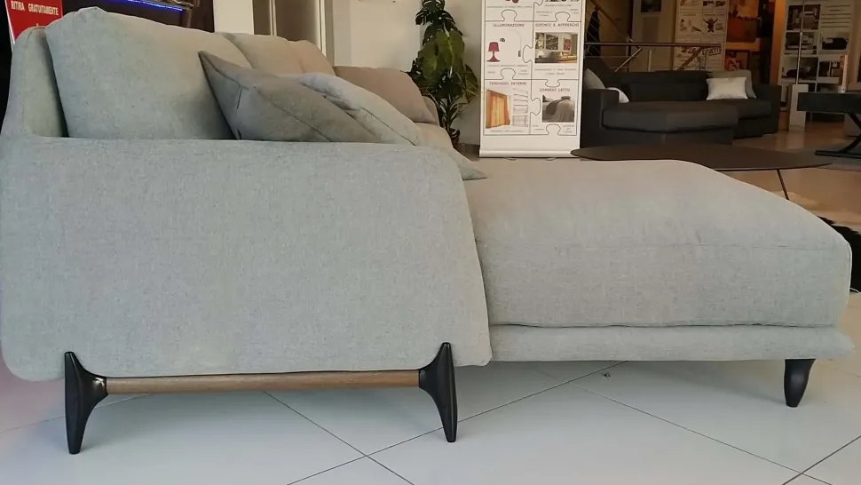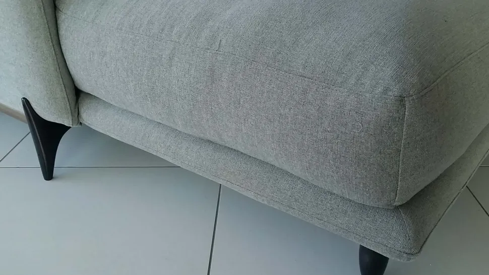 La particolarità del divano Elliot è anche il dettaglio del piedino realizzato in legno tinto eucalipto con particolari in metallo finitura cromo nero.