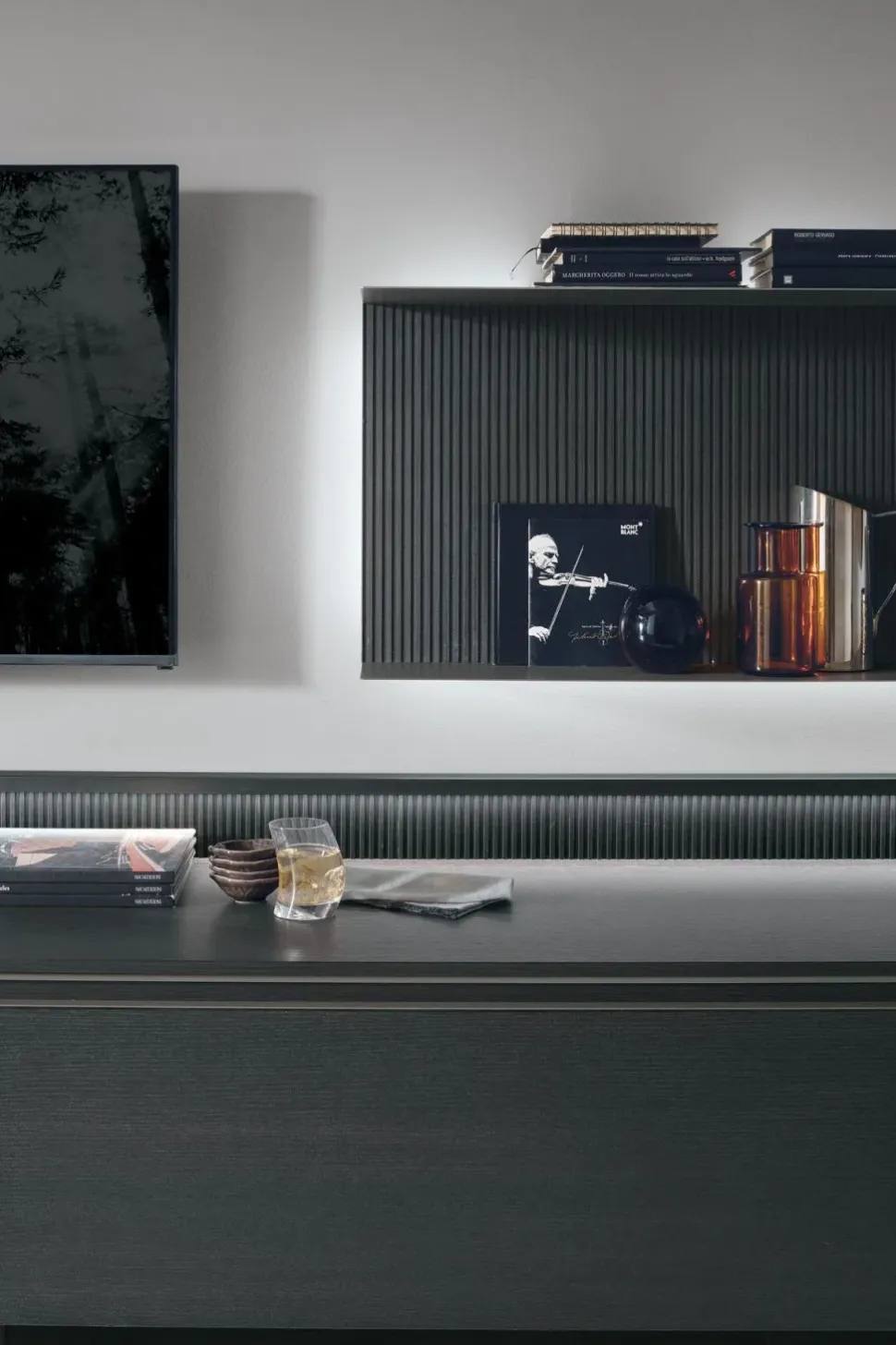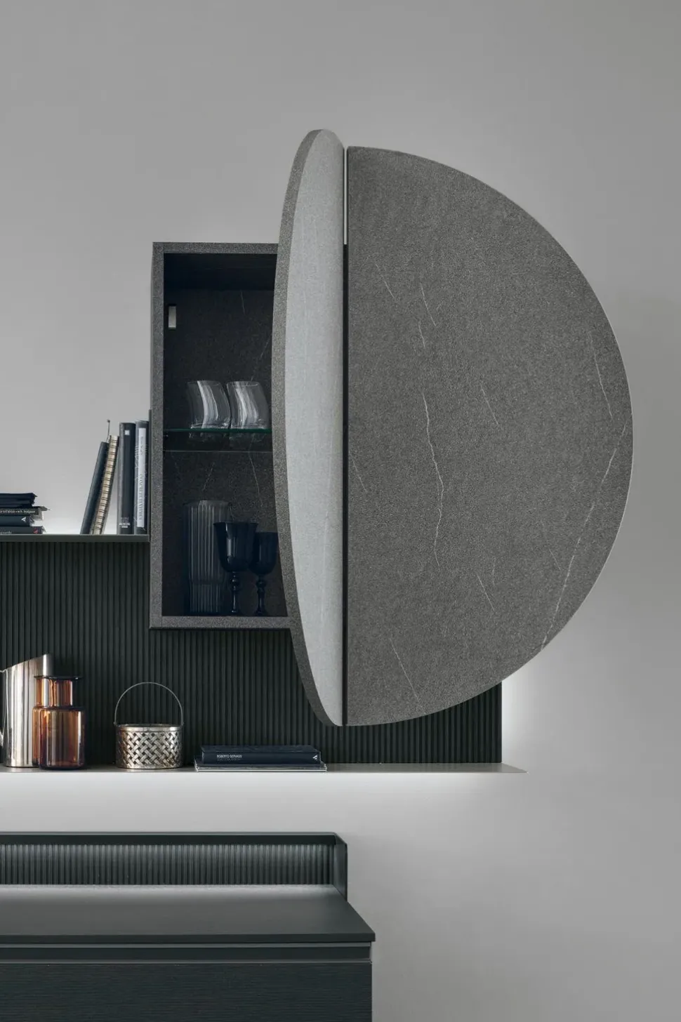 Dietro il frontale del pensile Dot si apre uno spazio utile per contenere. Il living si arricchisce di un nuovo elemento funzionale e allo stesso tempo decorativo, che evoca la pienezza della luna nella forma e nella matericità della finitura piasentina scura.