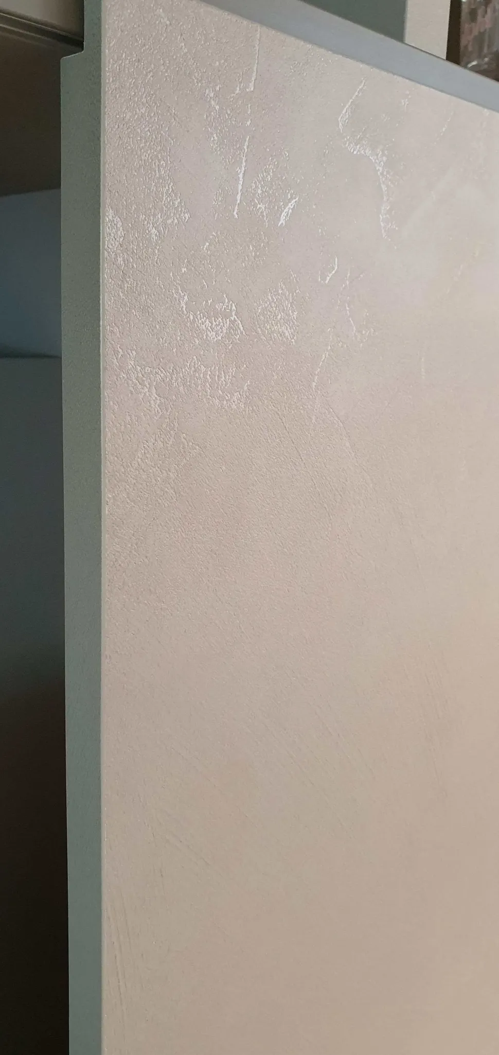 La finitura presente nella composizione è Materico Cemento Cava con elementi in metallo e binari in finitura Laccato Opaco colore Grigio Piacenza