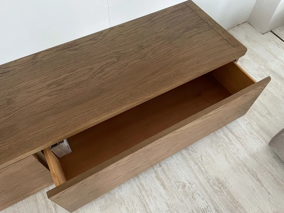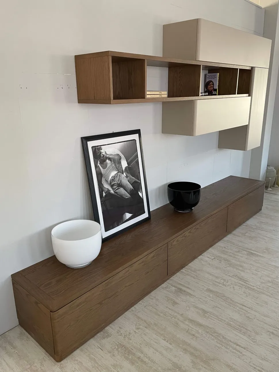 Le possibilità compositive del sistema componibile Fiori di Loto sono numerose e adattabili alle più diverse esigenze donando la possibilità di avere un living sempre differente. La composizione 7 si caratterizza per le basi lineari in rovere e per l’originale gioco d’incastri dei pensili che per questa composizione sono stati modulati in differenti tipologie per un uso variegato e completo del mobile. Il contrasto di chiari e di scuri del rovere e del laccato presente nei pensili dona al mobile un